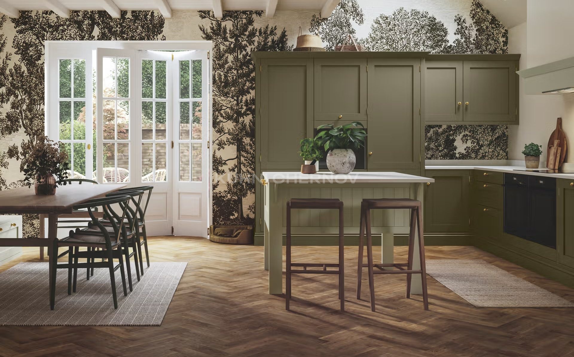 В оформлении возможны оригинальные декоративные решения — от витражей и карнизов до вставок, имитирующих бетон или дерево, что подчёркивает индивидуальность и характер кухни.