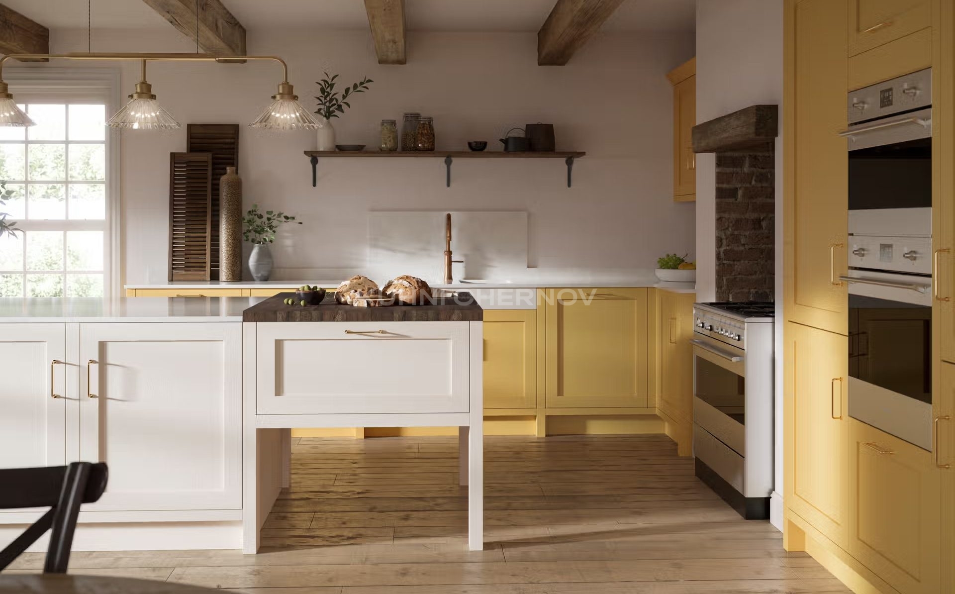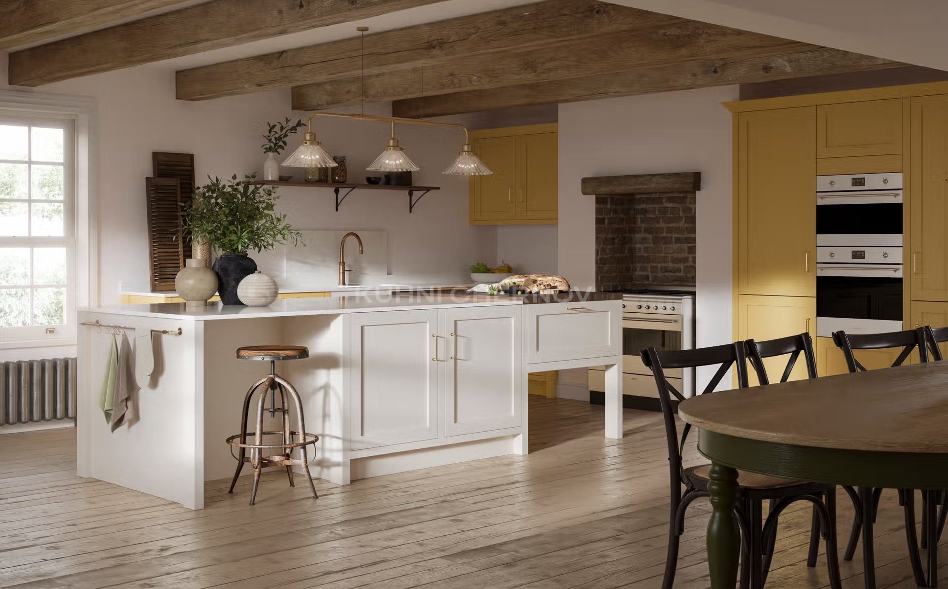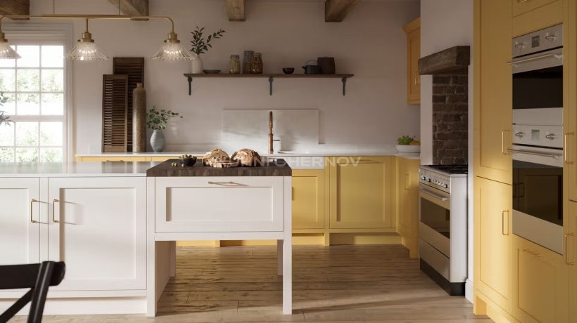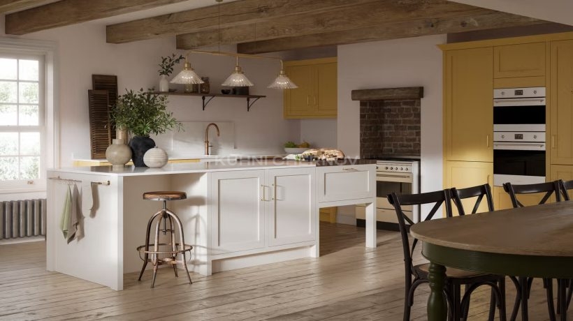 В оформлении возможны оригинальные декоративные решения — от витражей и карнизов до вставок, имитирующих бетон или дерево, что подчёркивает индивидуальность и характер кухни.