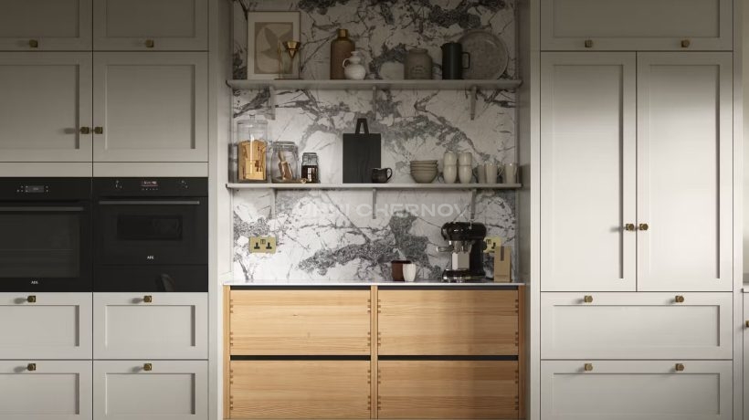 В оформлении возможны оригинальные декоративные решения — от витражей и карнизов до вставок, имитирующих бетон или дерево, что подчёркивает индивидуальность и характер кухни.