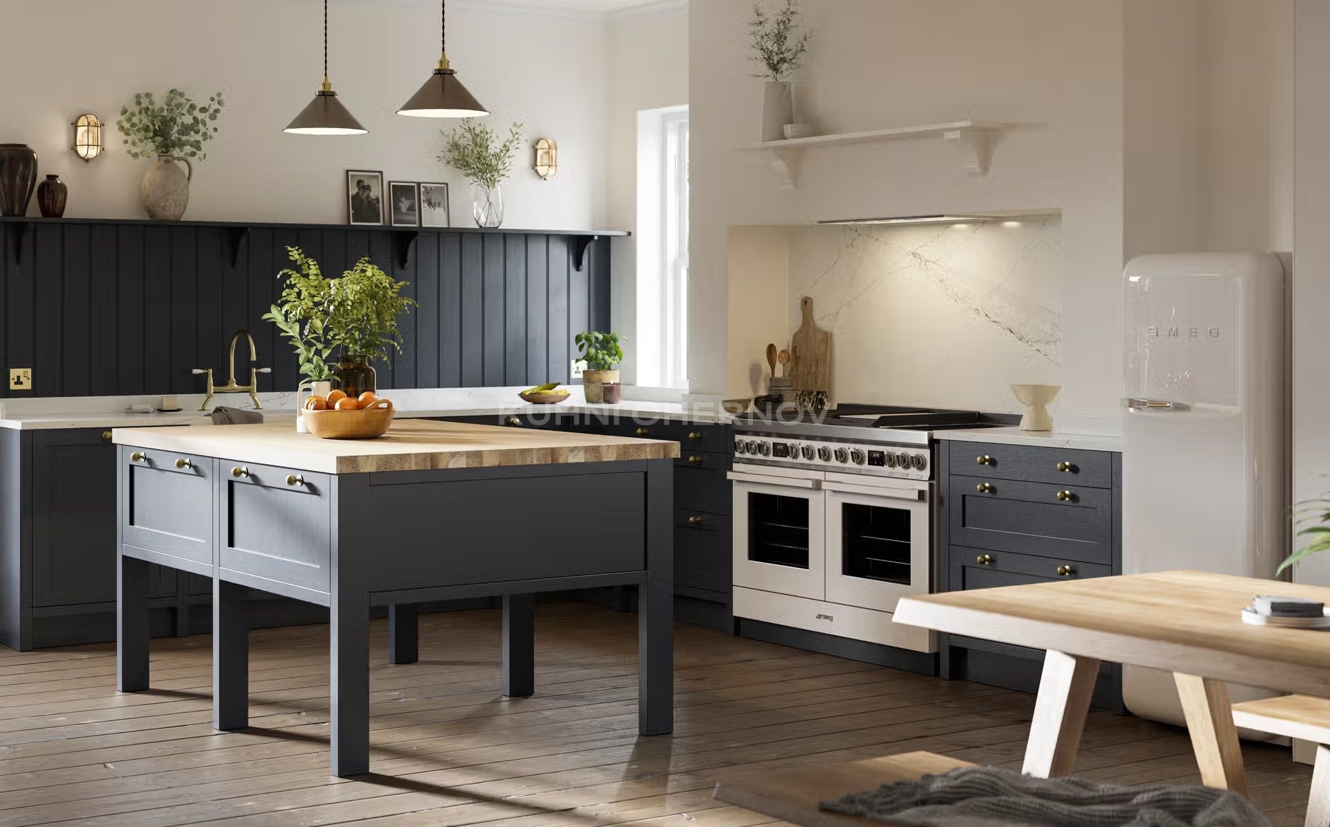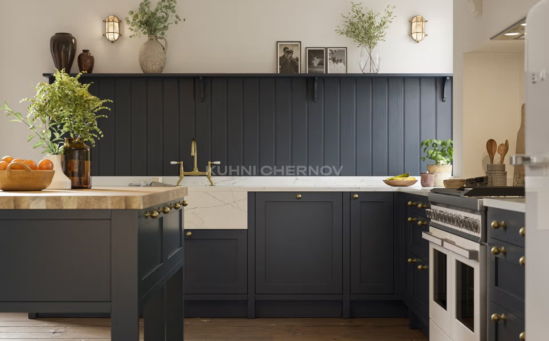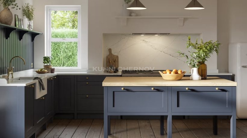 В оформлении возможны оригинальные декоративные решения — от витражей и карнизов до вставок, имитирующих бетон или дерево, что подчёркивает индивидуальность и характер кухни.