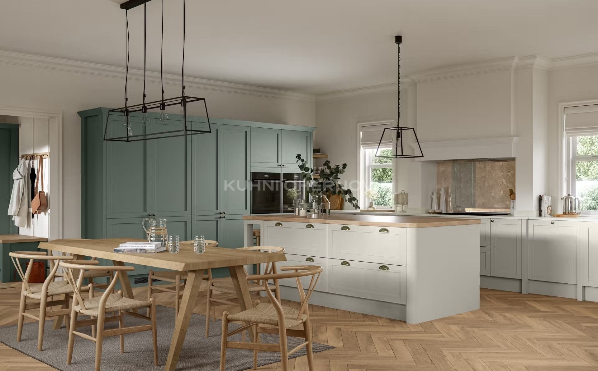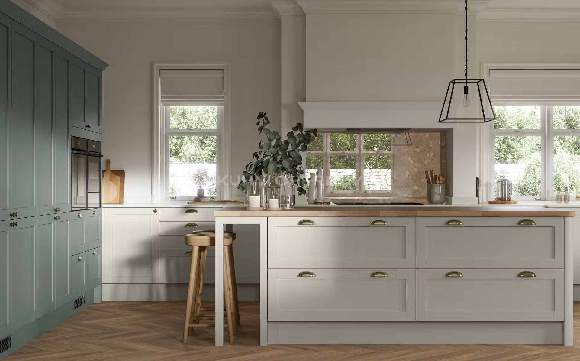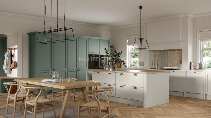 В оформлении возможны оригинальные декоративные решения — от витражей и карнизов до вставок, имитирующих бетон или дерево, что подчёркивает индивидуальность и характер кухни.