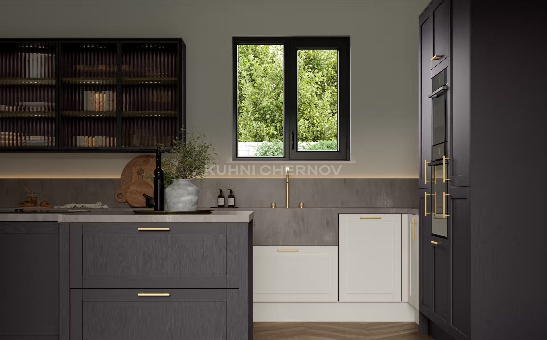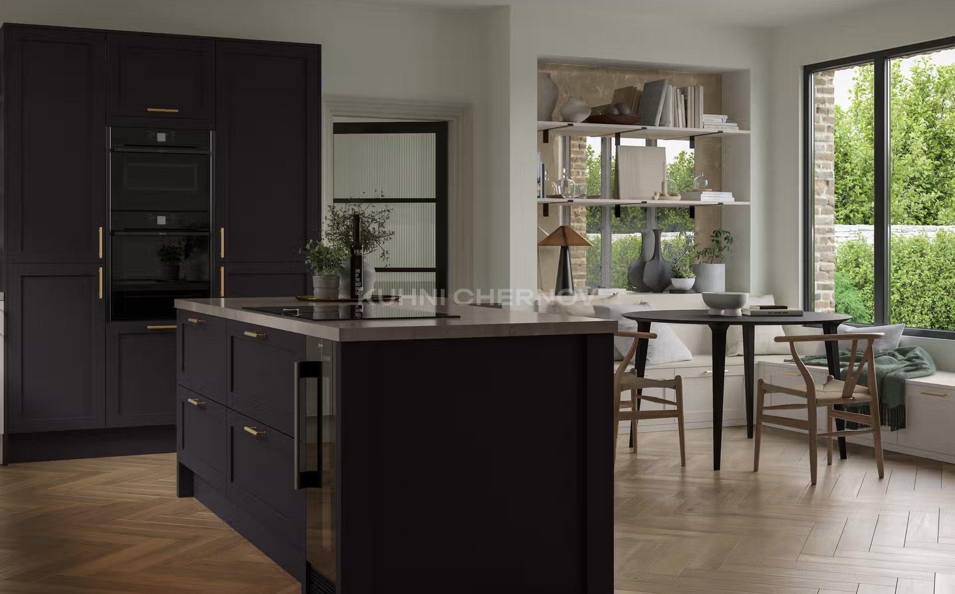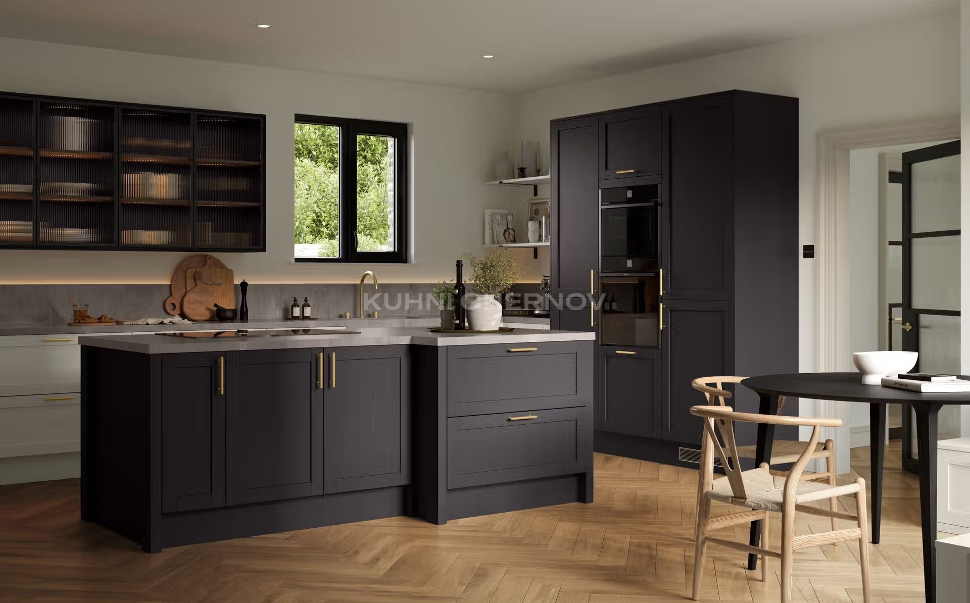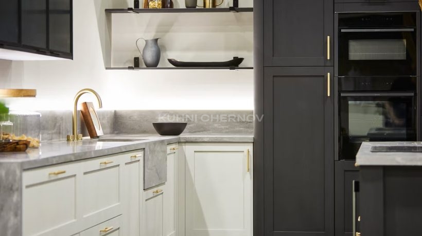 В оформлении возможны оригинальные декоративные решения — от витражей и карнизов до вставок, имитирующих бетон или дерево, что подчёркивает индивидуальность и характер кухни.