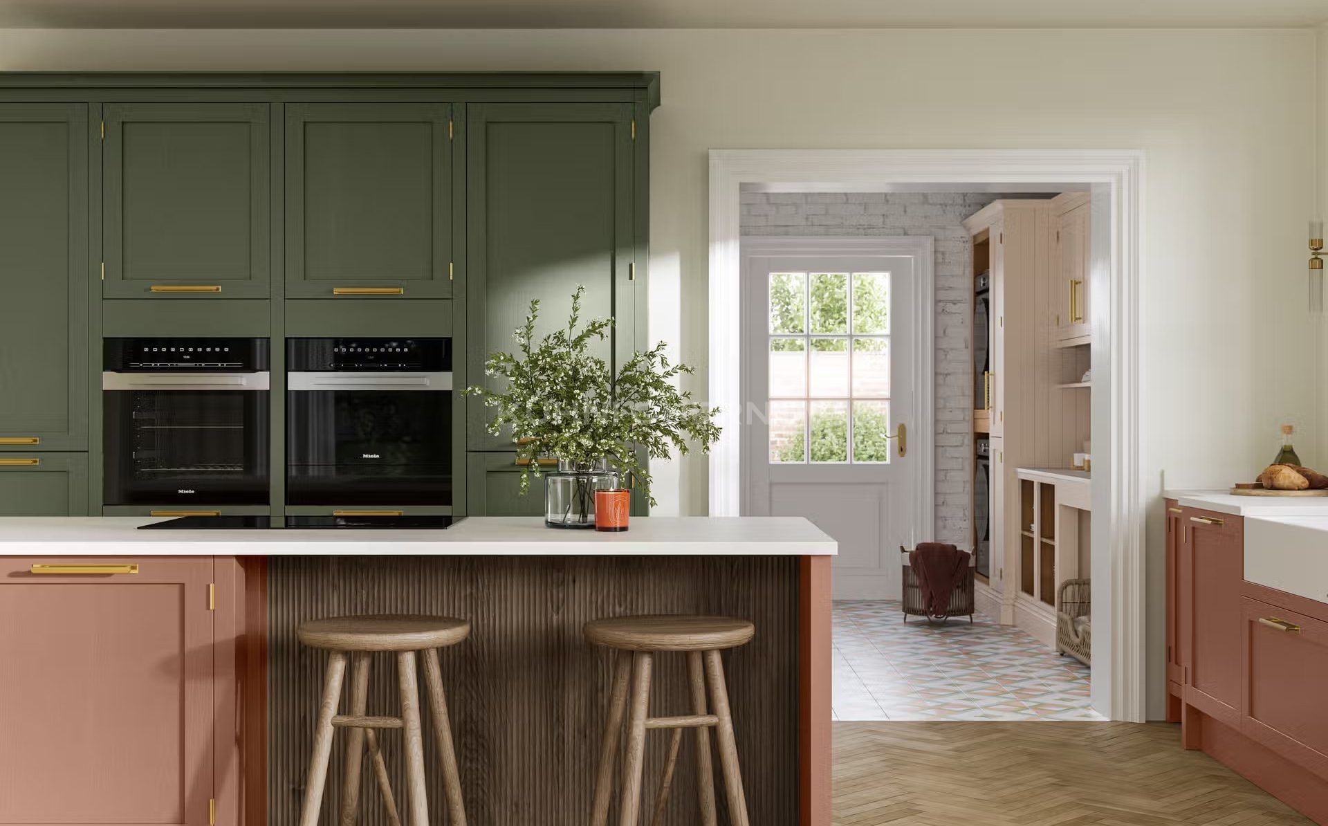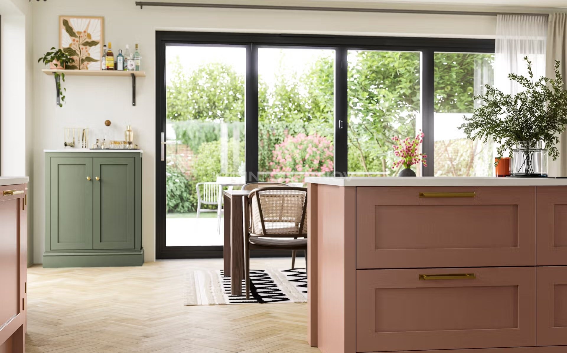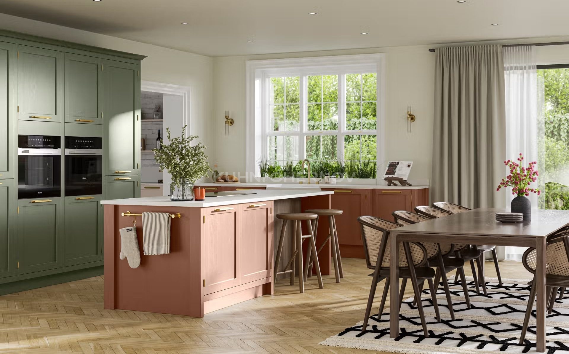 В оформлении возможны оригинальные декоративные решения — от витражей и карнизов до вставок, имитирующих бетон или дерево, что подчёркивает индивидуальность и характер кухни.