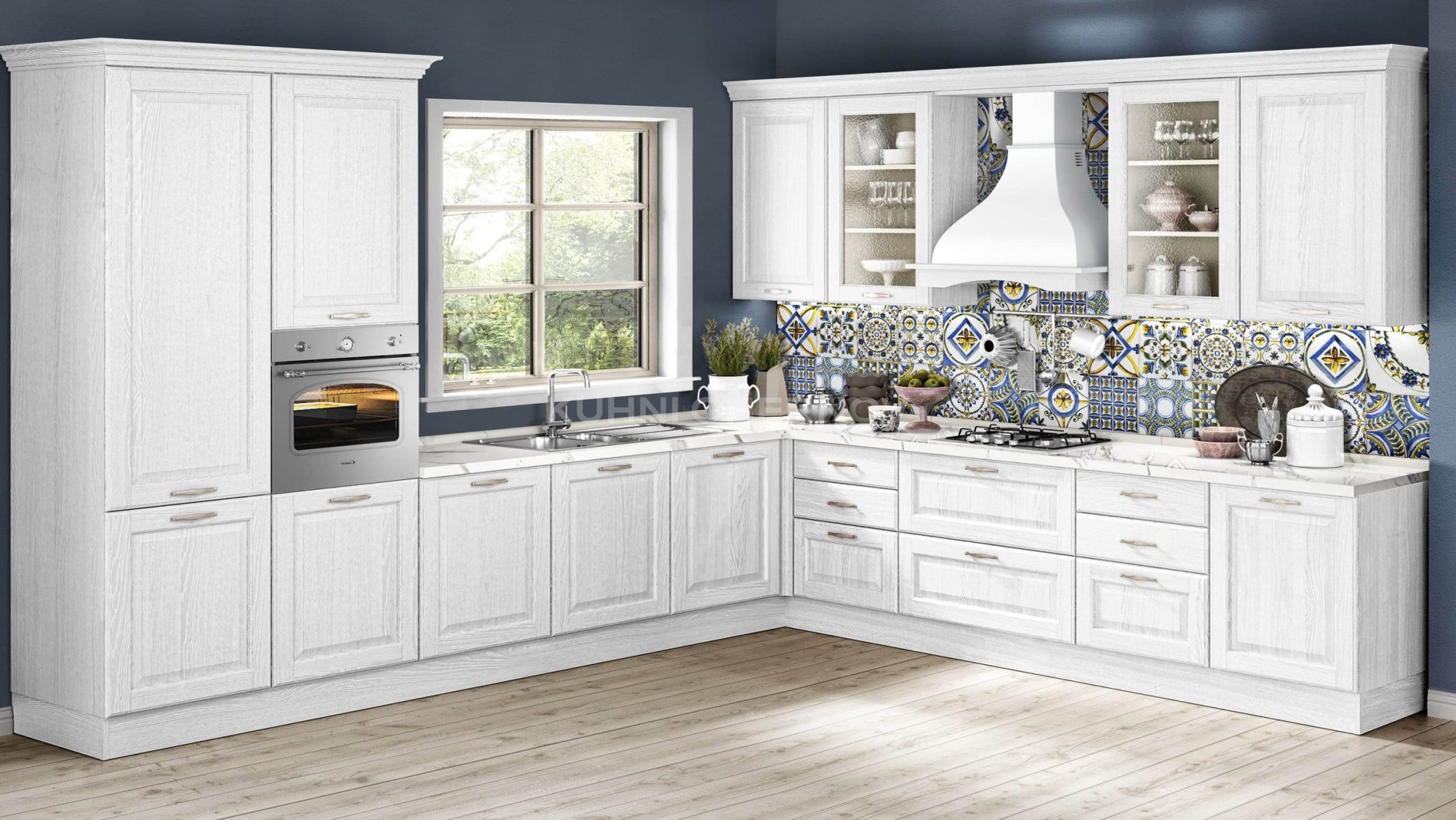 Кассиана — классическая кухня с фасадами из МДФ, покрытого термопластиком. Такое покрытие практично, долговечно и отлично передаёт форму и рельеф.