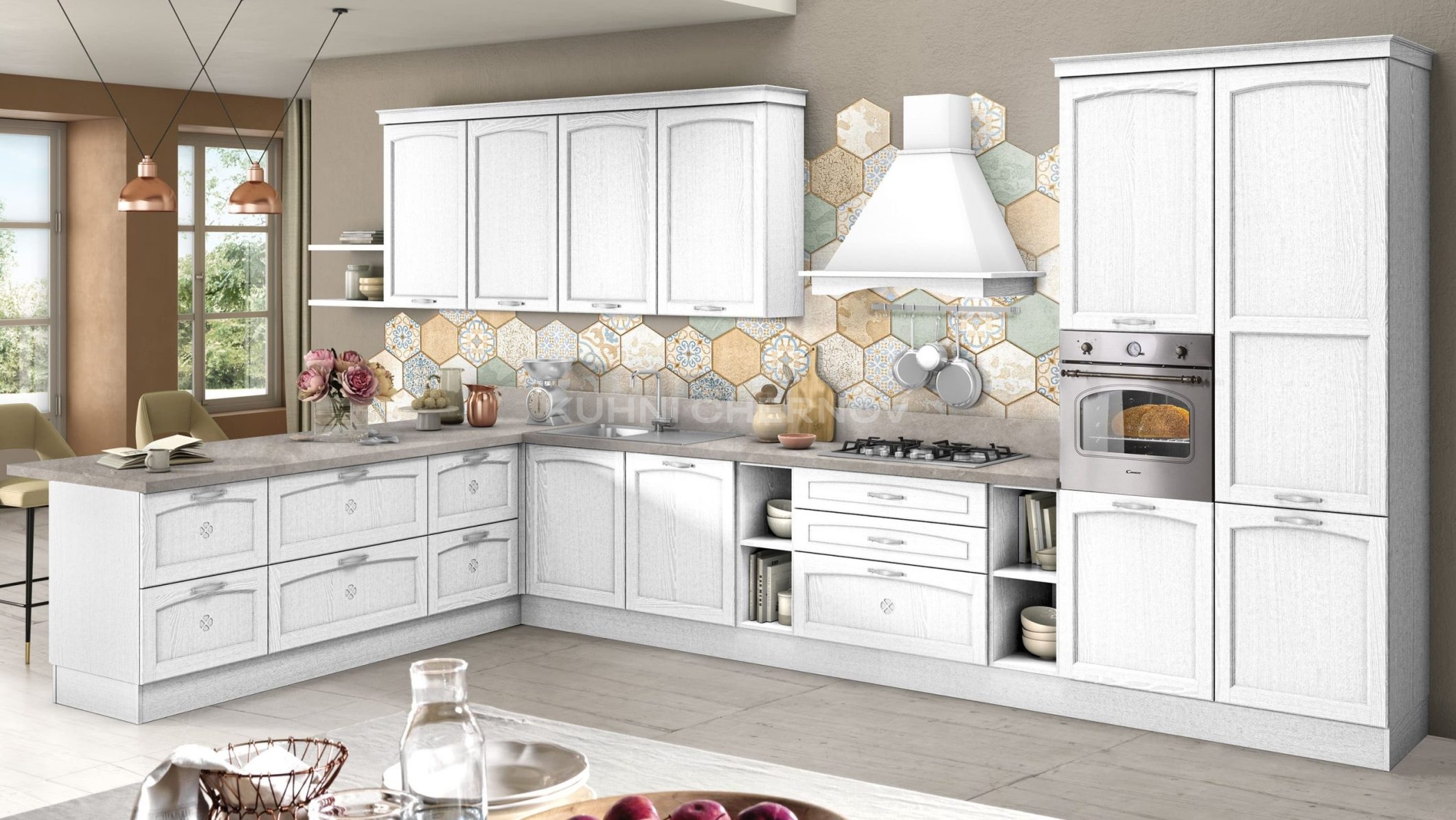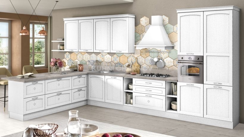 Кассиана — классическая кухня с фасадами из МДФ, покрытого термопластиком. Такое покрытие практично, долговечно и отлично передаёт форму и рельеф.