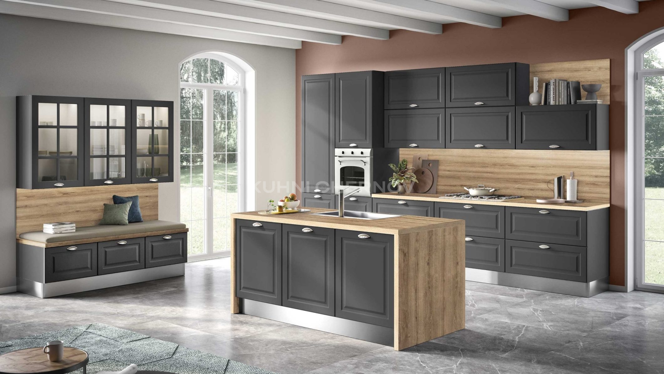 Корпуса кухни изготовлены из ЛДСП ведущих производителей и могут быть выполнены в разных цветовых решениях. Кухня комплектуется качественной фурнитурой по вашему выбору — от надёжных петель до ящиков с доводчиками и функциональной внутренней оснастки.