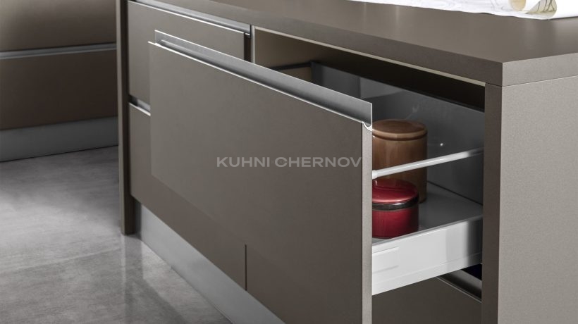 Оснащается петлями с доводчиками Blum, Boyard или GTV, ящиками полного выдвижения с системой soft close, а также дополнительной фурнитурой: бутылочницами, подъёмными механизмами, внутренними разделителями и встроенной подсветкой.