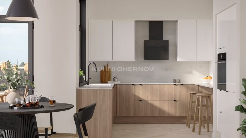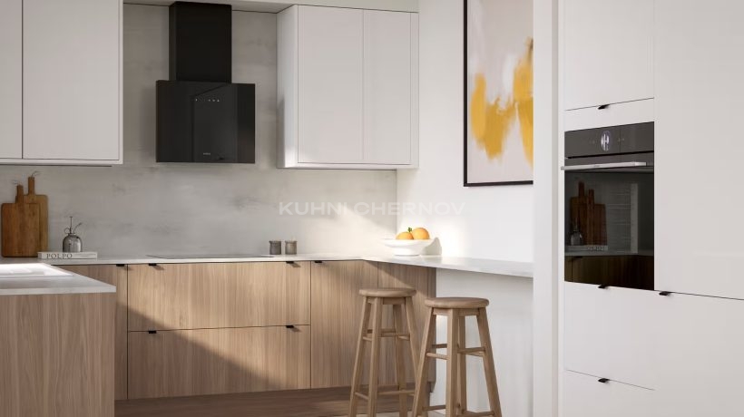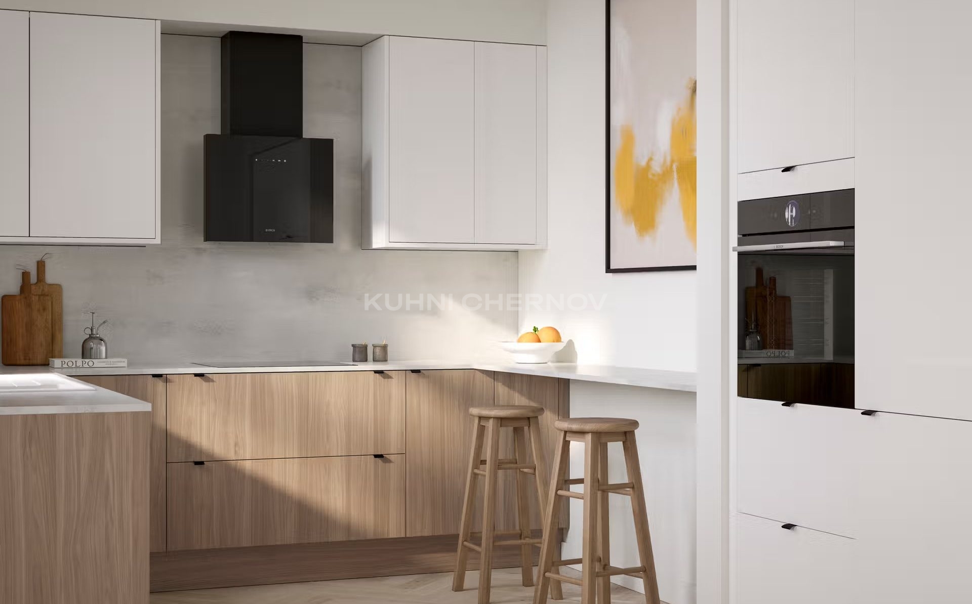 Кухня может быть выполнена в двухцветном исполнении, а также сочетаться с другими типами фасадов — например, шпоном, эмалью или термопластиком, создавая яркие акценты или мягкие контрасты в интерьере.