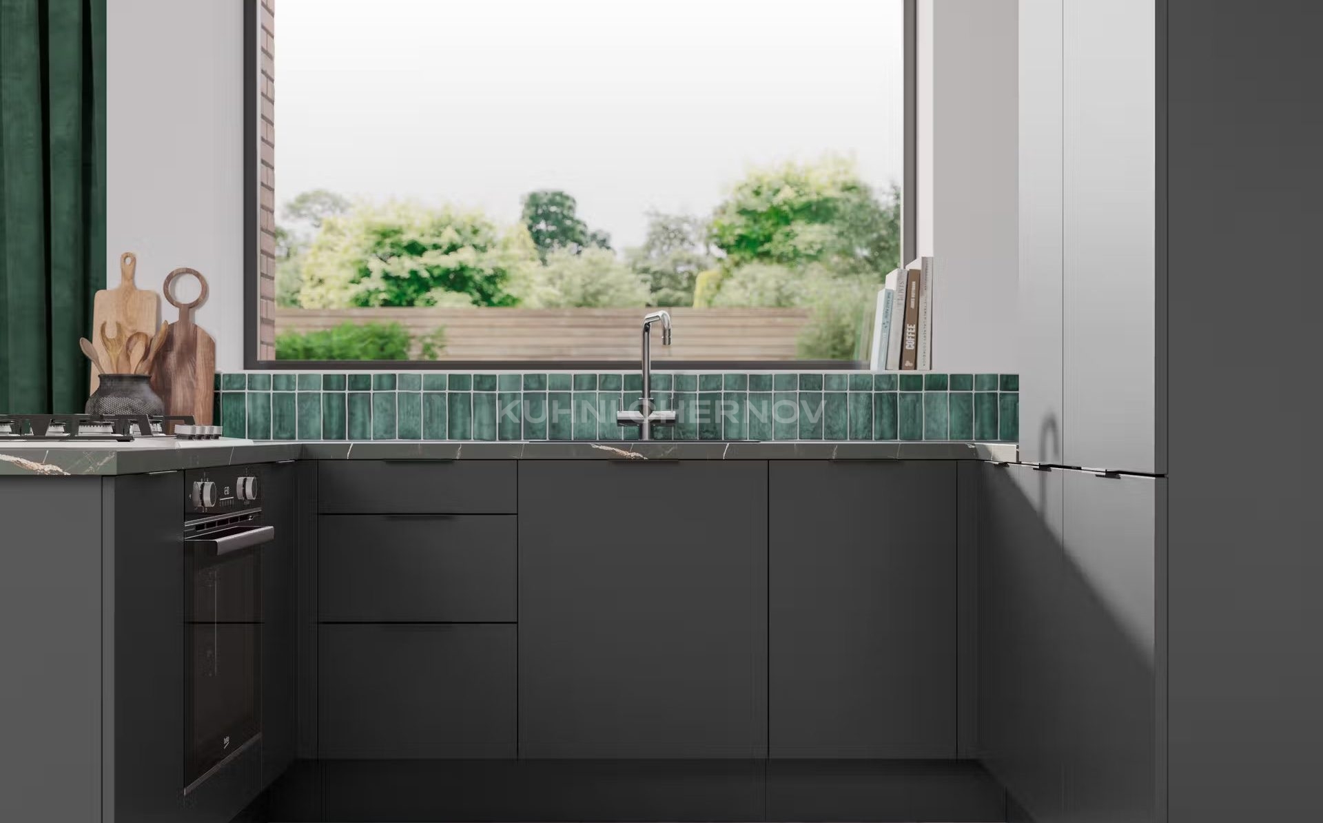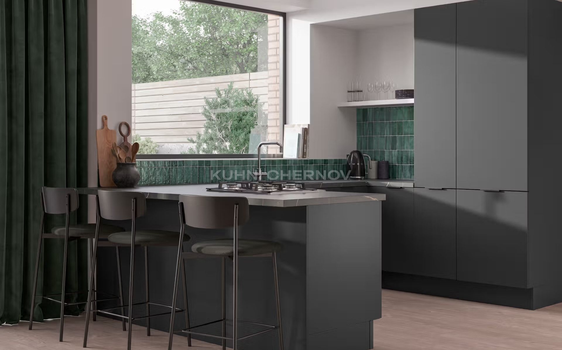 Оснащается петлями с доводчиками Blum, Boyard или GTV, ящиками полного выдвижения с системой soft close, а также дополнительной фурнитурой: бутылочницами, подъёмными механизмами, внутренними разделителями и встроенной подсветкой.