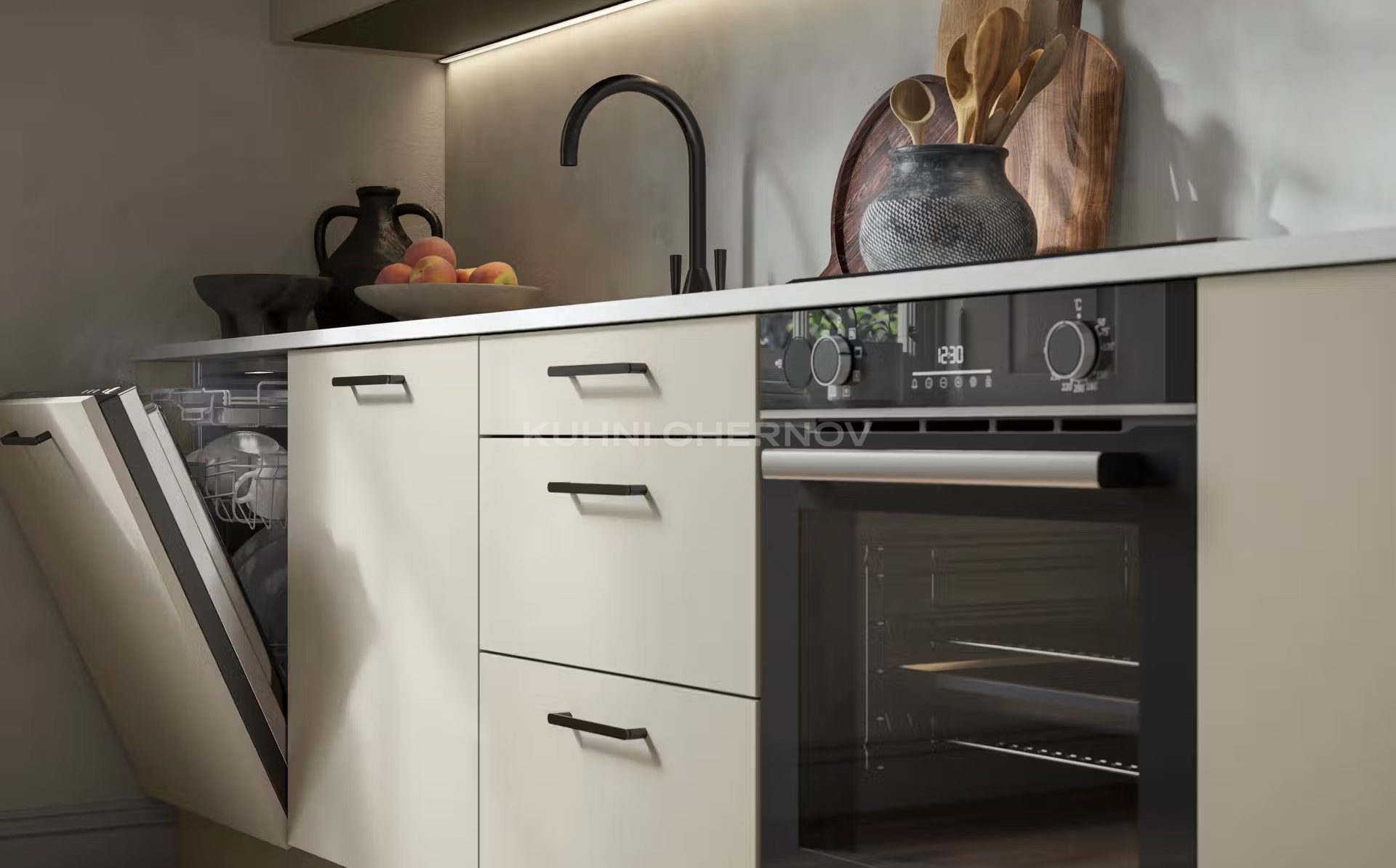 Оснащается петлями с доводчиками Blum, Boyard или GTV, ящиками полного выдвижения с системой soft close, а также дополнительной фурнитурой: бутылочницами, подъёмными механизмами, внутренними разделителями и встроенной подсветкой.