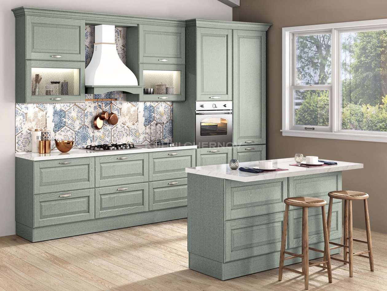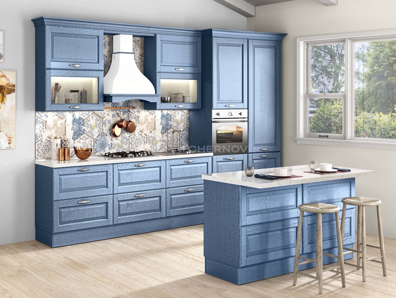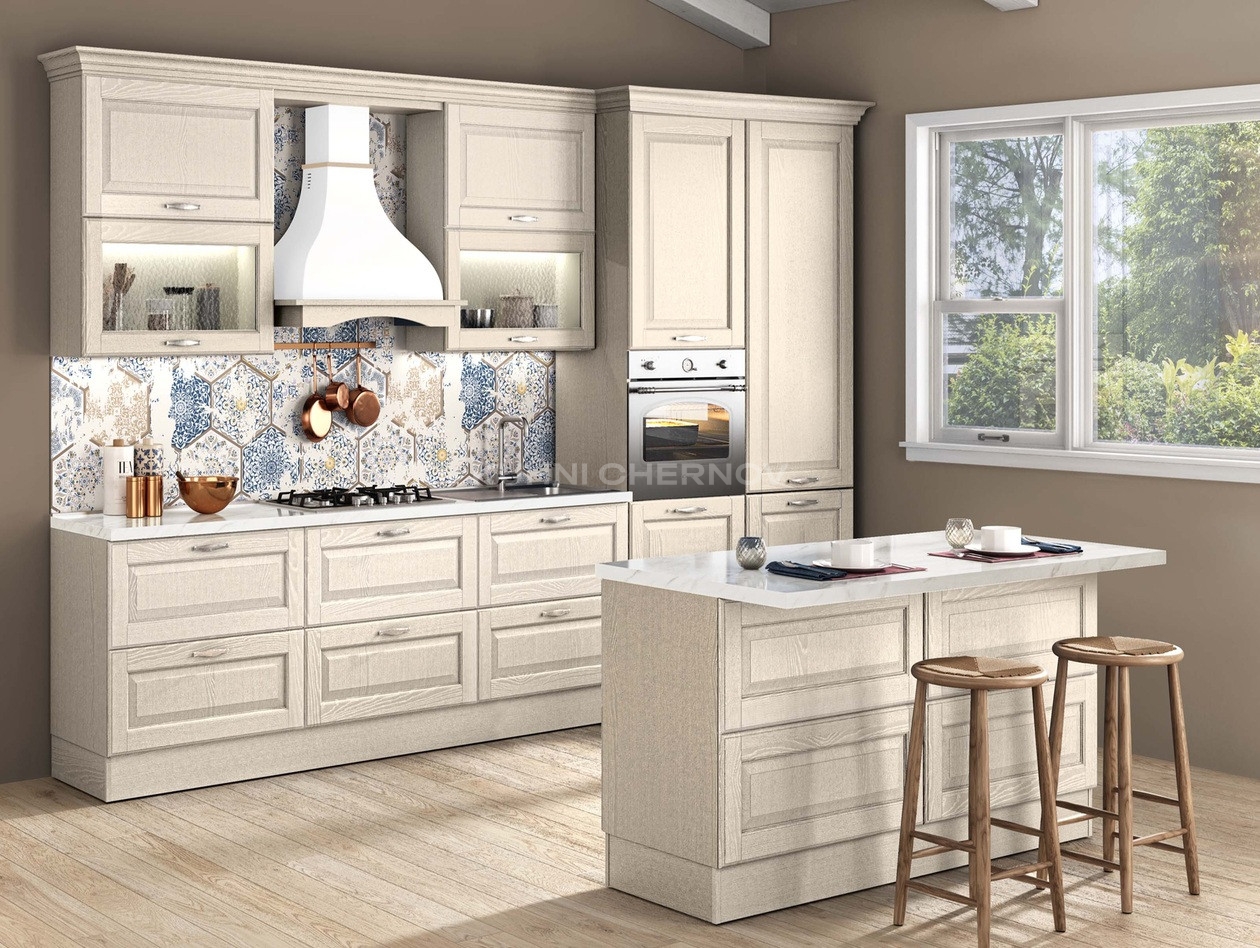 Кассиана — классическая кухня с фасадами из МДФ, покрытого термопластиком. Такое покрытие практично, долговечно и отлично передаёт форму и рельеф.
