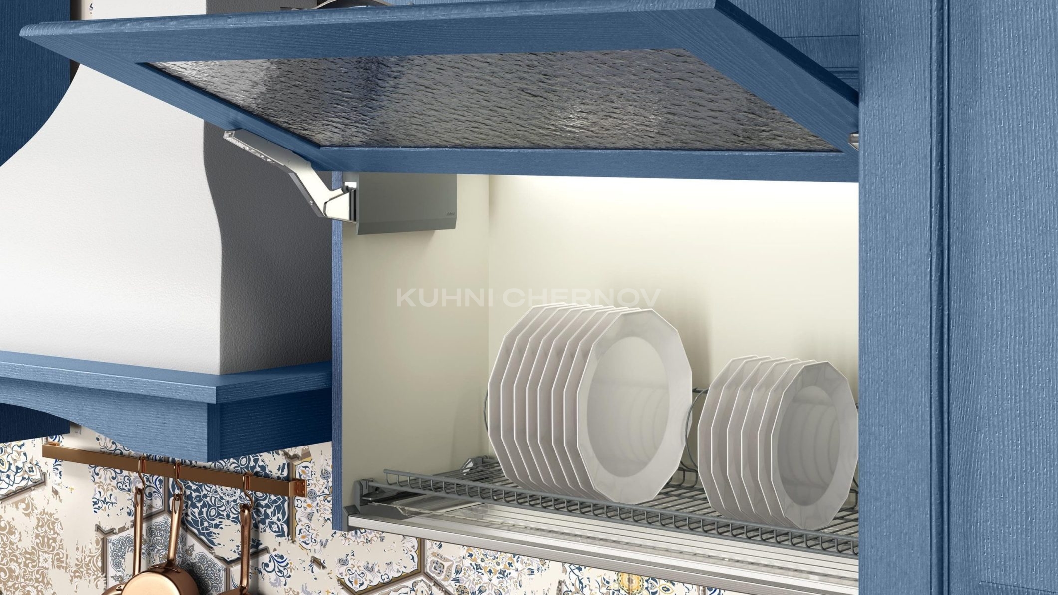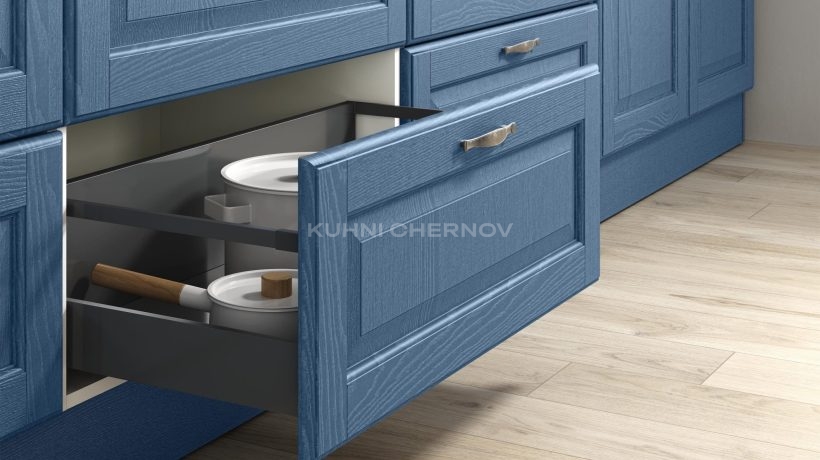 Кухня укомплектована качественной фурнитурой с доводчиками, ящиками полного выдвижения, подъёмными механизмами и внутренними аксессуарами — всё подбирается по вашему желанию.