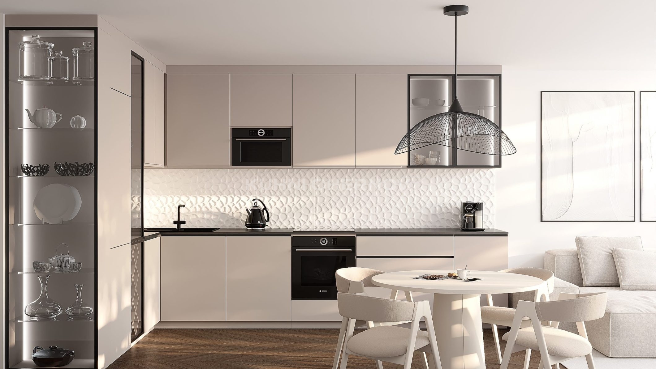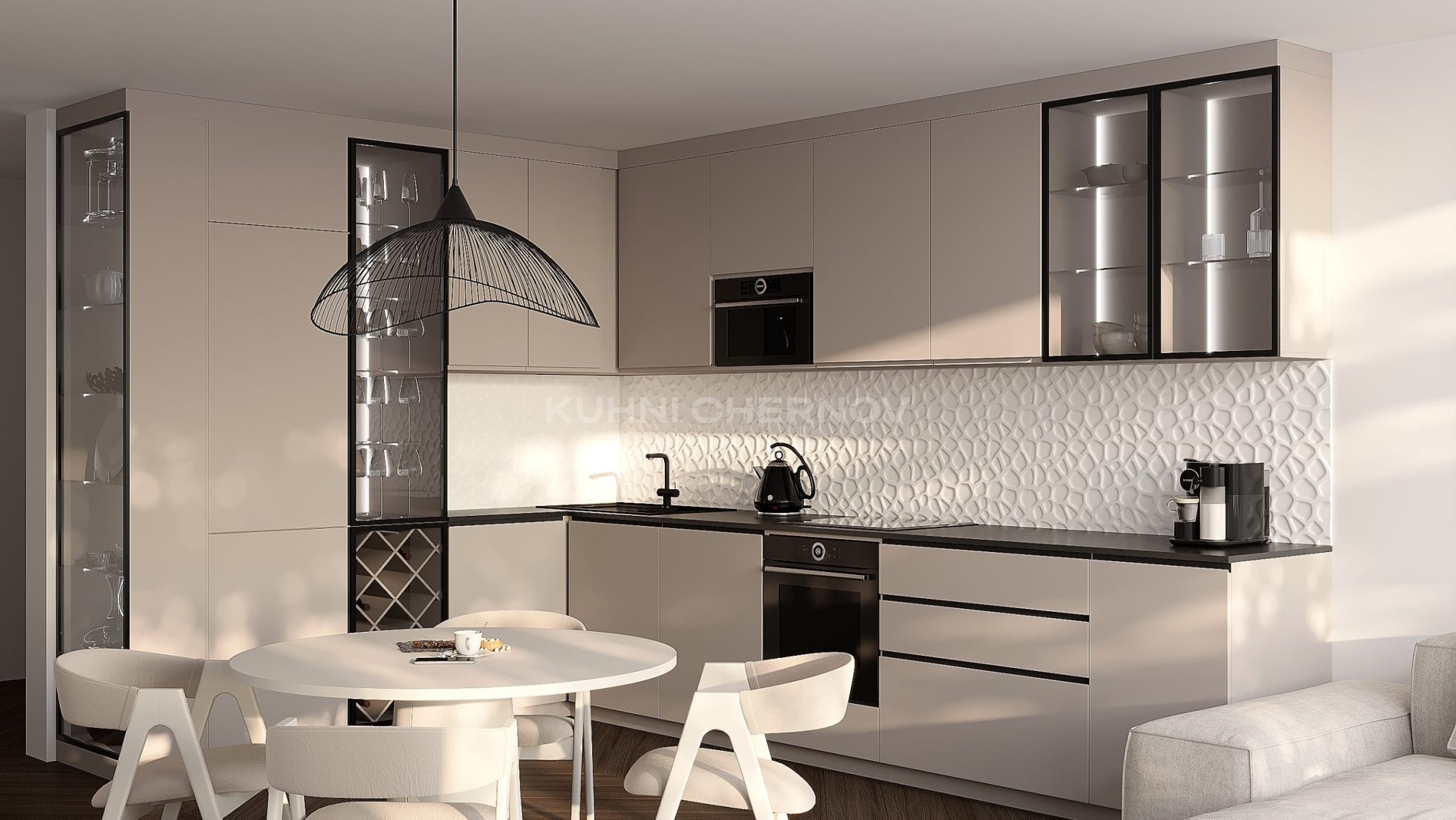 Ключевая особенность — безручечное исполнение с интегрированным алюминиевым G-образным профилем, подчёркивающим строгую геометрию и создающим цельный, лаконичный образ.