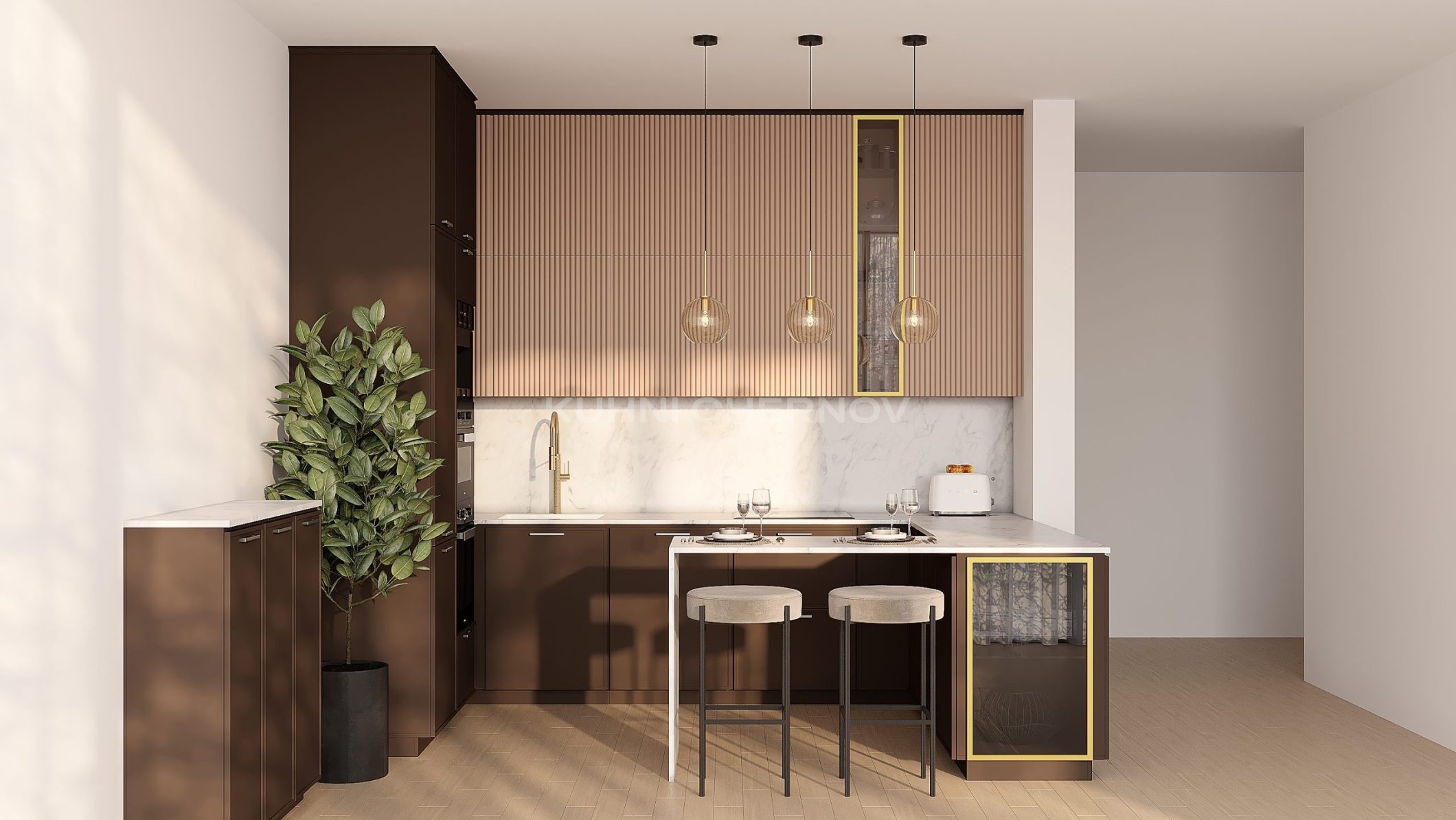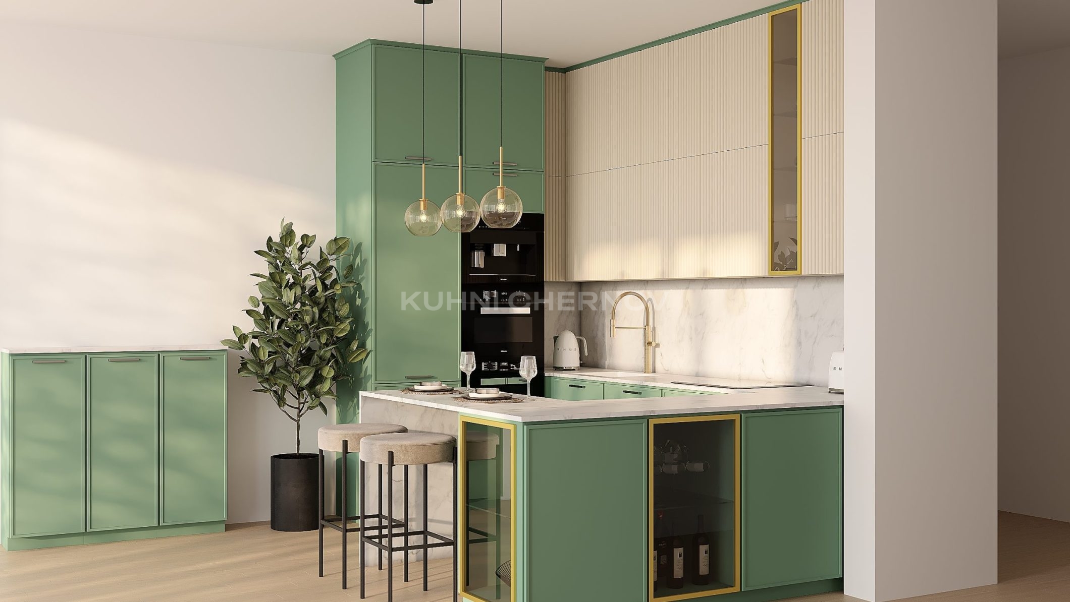 Лоретта — это серия кухонь с фасадами из эмали: гладкими и рифлёными. Сочетание текстур и лаконичных форм создаёт выразительный, современный образ с лёгким налётом ар-деко.