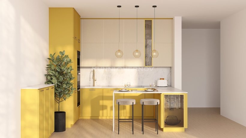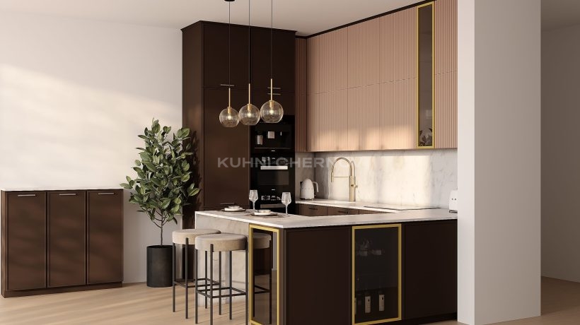Кухня может быть выполнена в двухцветном варианте, сочетаться с витринами в алюминиевых рамках и адаптироваться под любые планировки.