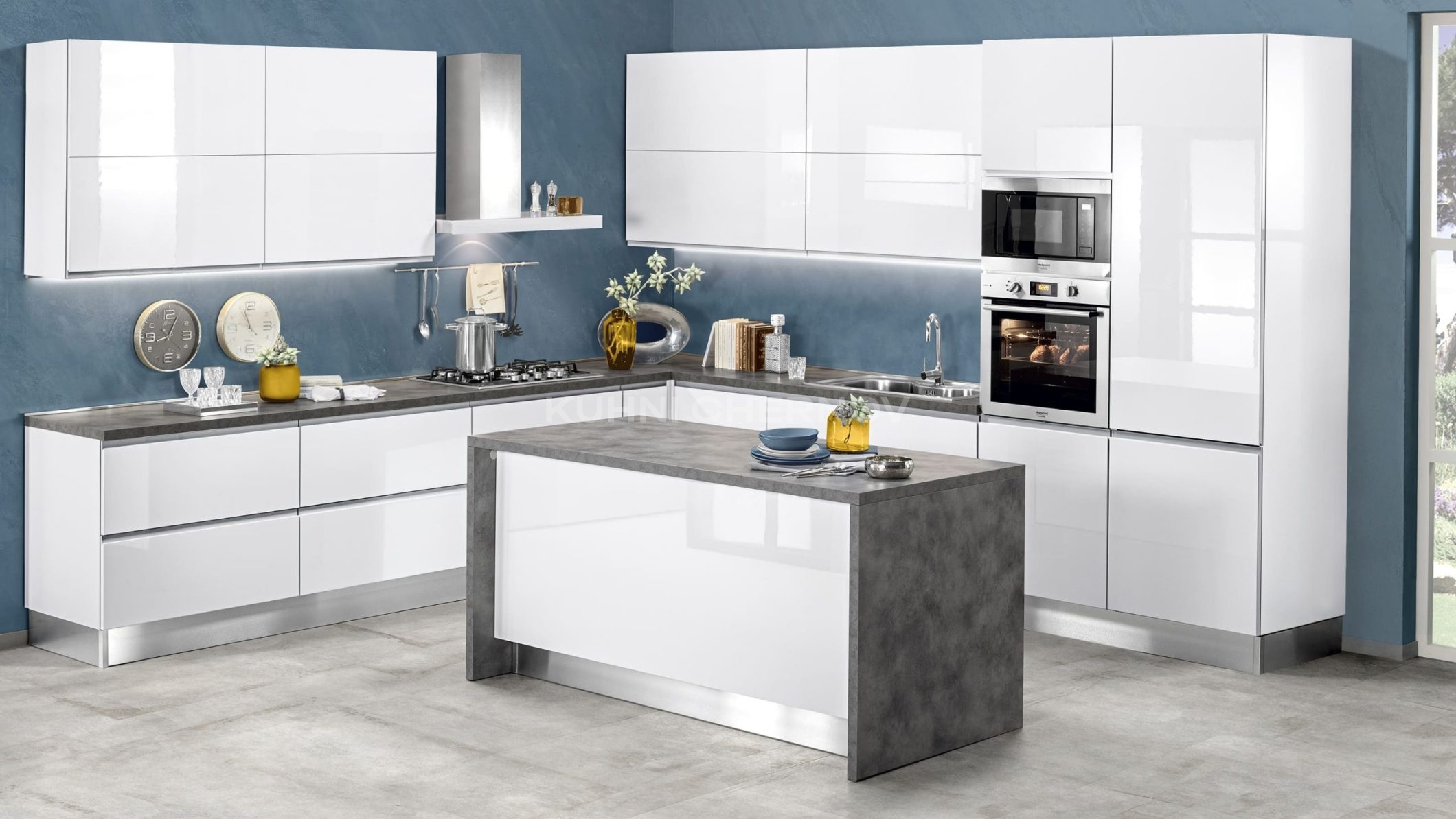 Кухня может быть выполнена в двухцветном варианте, сочетаться с витринами в алюминиевых рамках и адаптироваться под любые планировки.