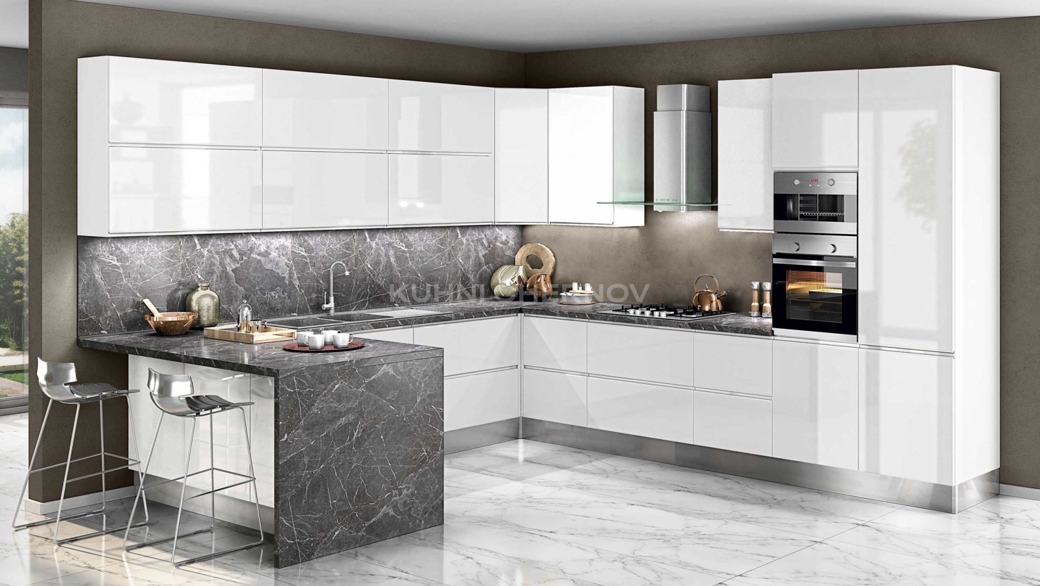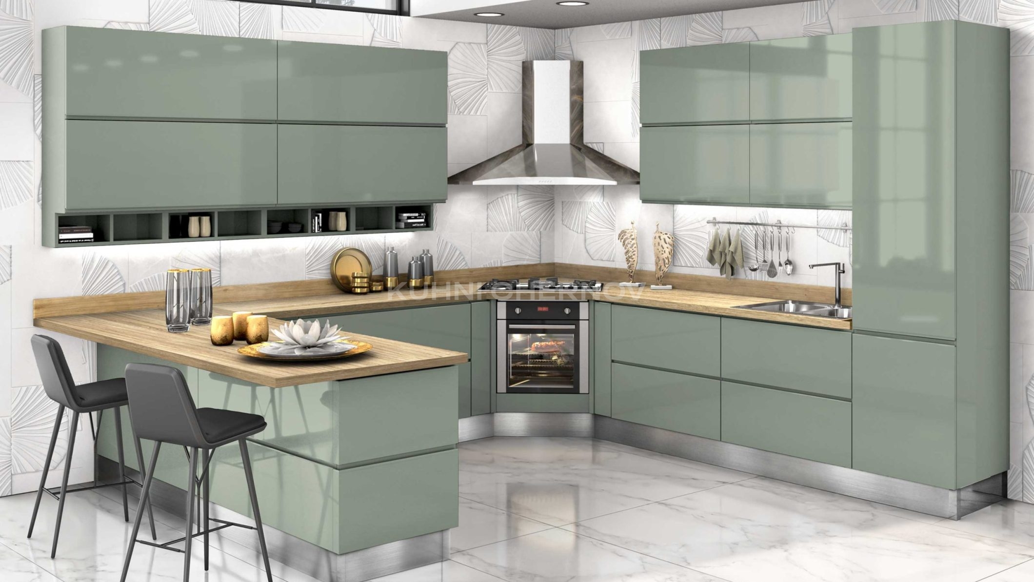Лоретта — это серия кухонь с фасадами из эмали: гладкими и рифлёными. Сочетание текстур и лаконичных форм создаёт выразительный, современный образ с лёгким налётом ар-деко.