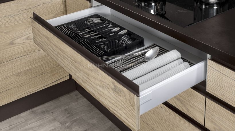 Кухня укомплектована лучшей фурнитурой по вашему выбору: петли с доводчиками, ящики полного выдвижения с системой soft close, подъёмные механизмы, бутылочницы, внутренние разделители и подсветка от ведущих мировых производителей.