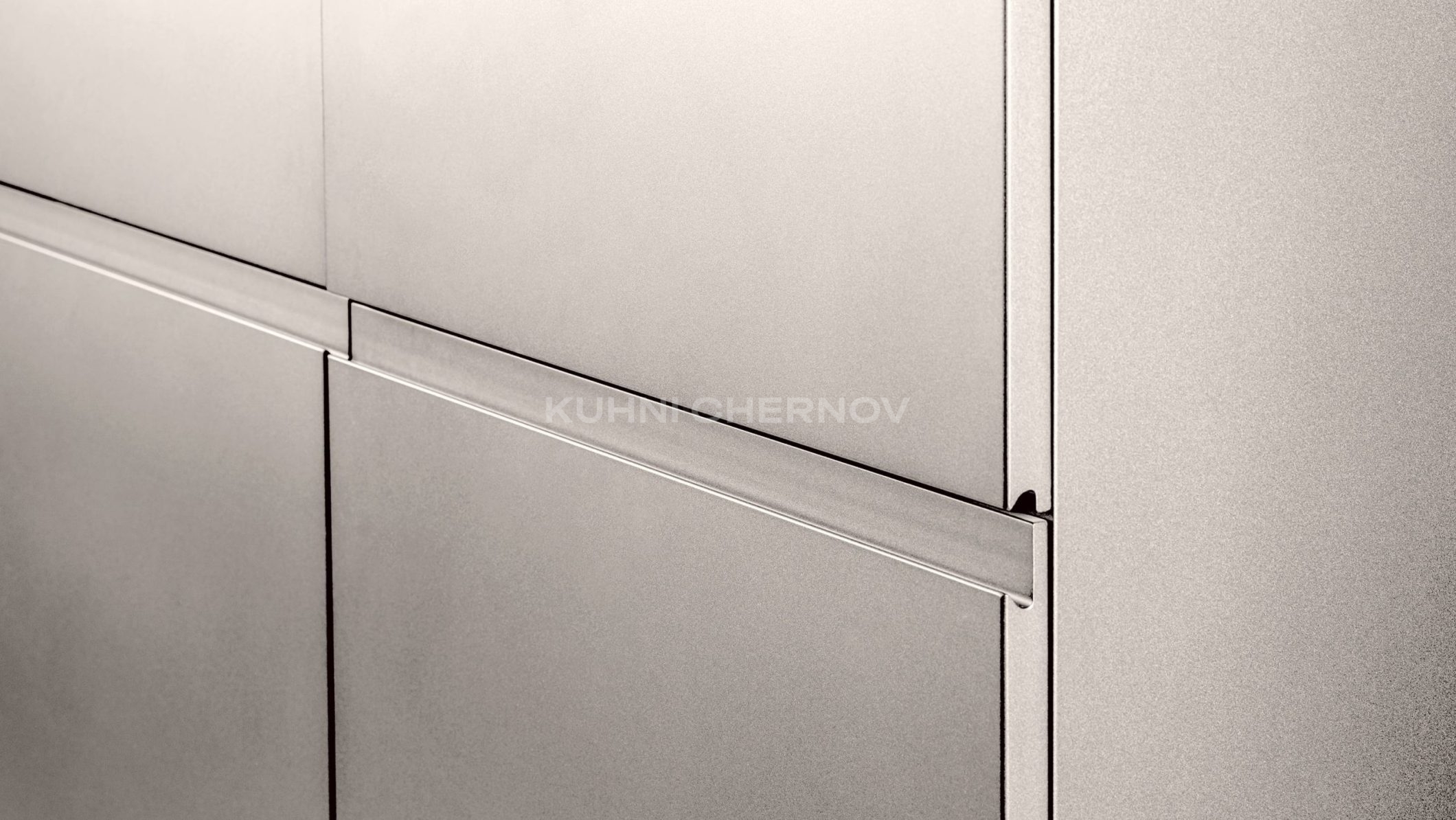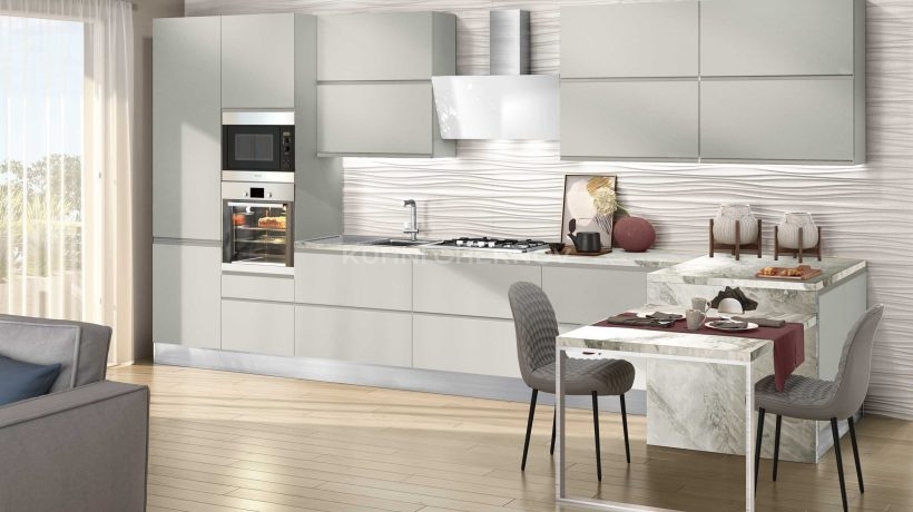 Лоретта — это серия кухонь с фасадами из эмали: гладкими и рифлёными. Сочетание текстур и лаконичных форм создаёт выразительный, современный образ с лёгким налётом ар-деко.