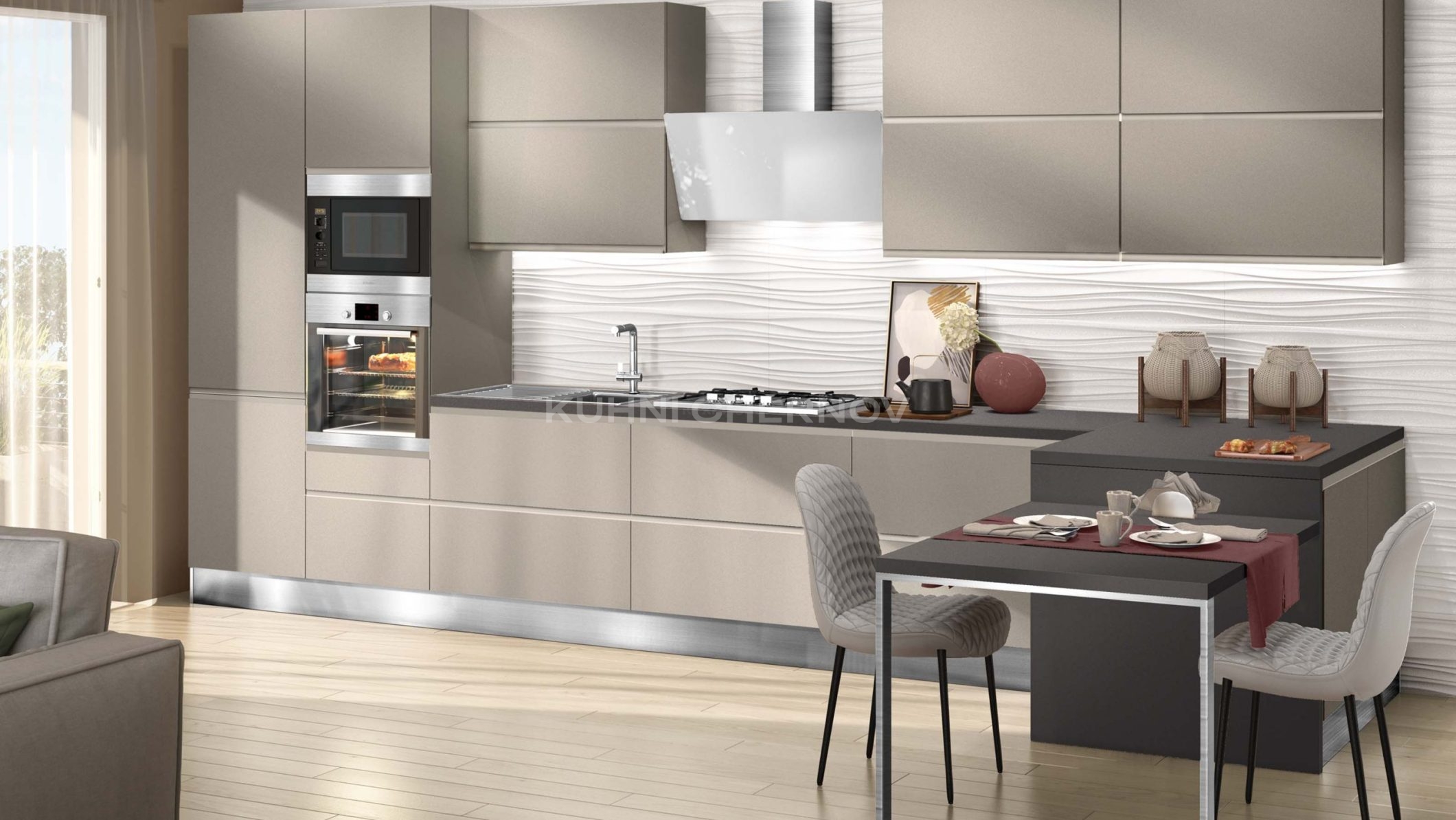 Кухня может быть выполнена в двухцветном варианте, сочетаться с витринами в алюминиевых рамках и адаптироваться под любые планировки.