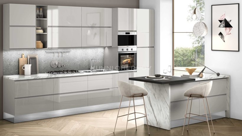 Кухня может быть выполнена в двухцветном варианте, сочетаться с витринами в алюминиевых рамках и адаптироваться под любые планировки.