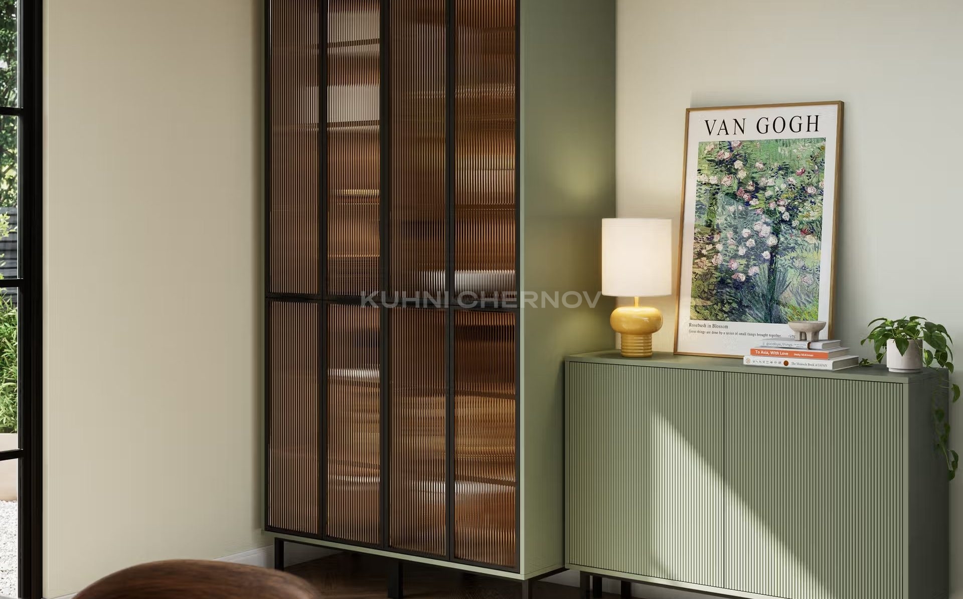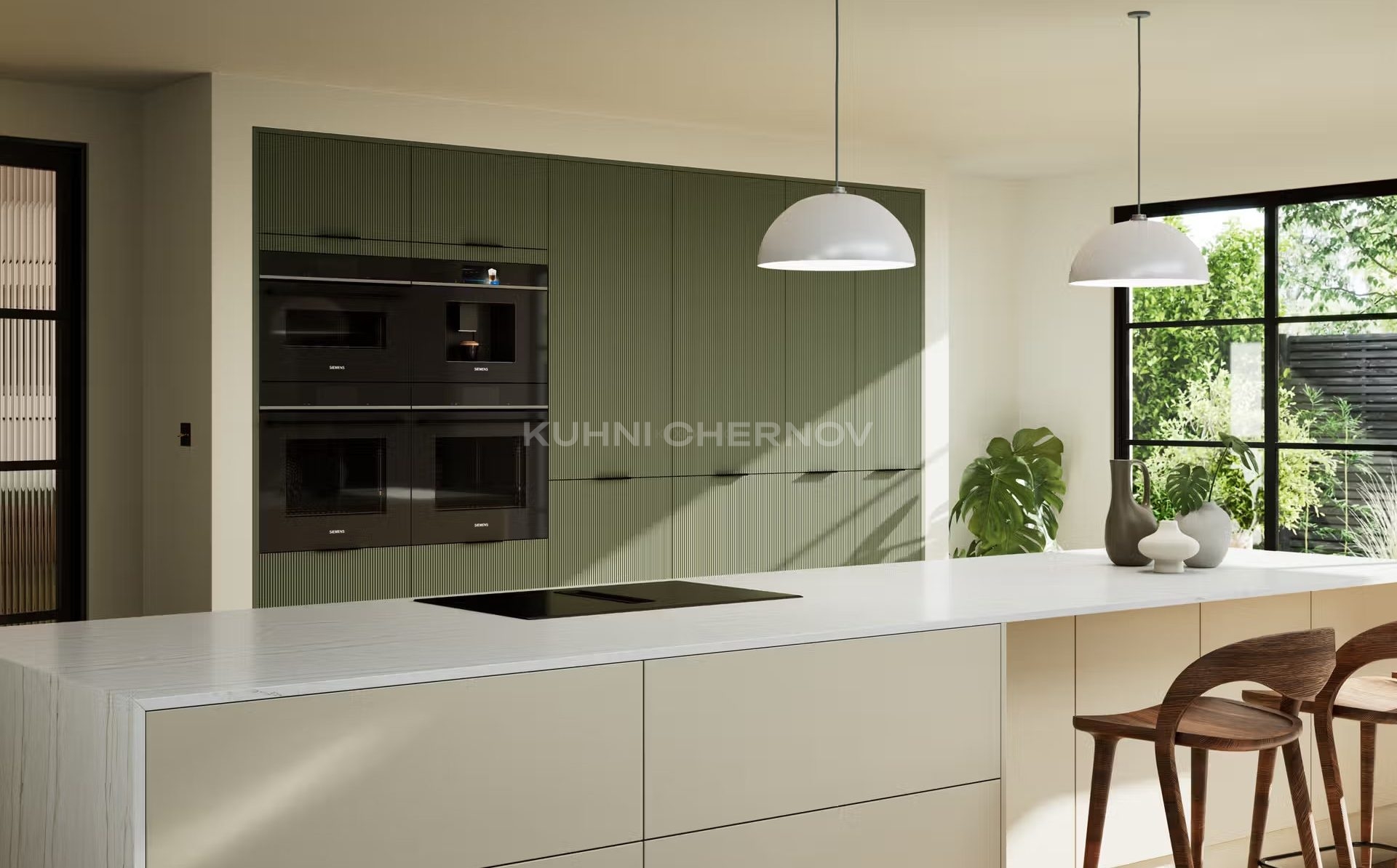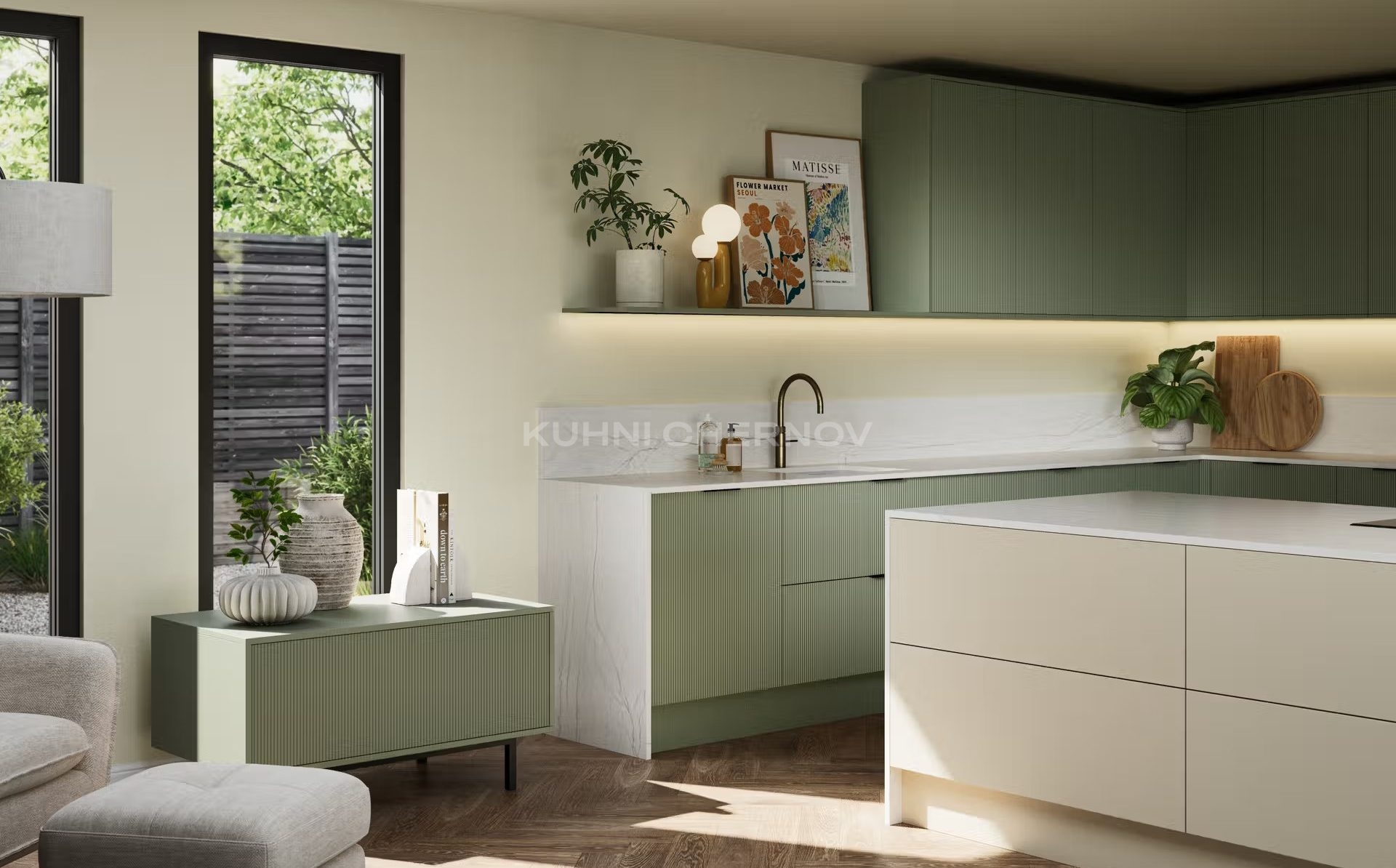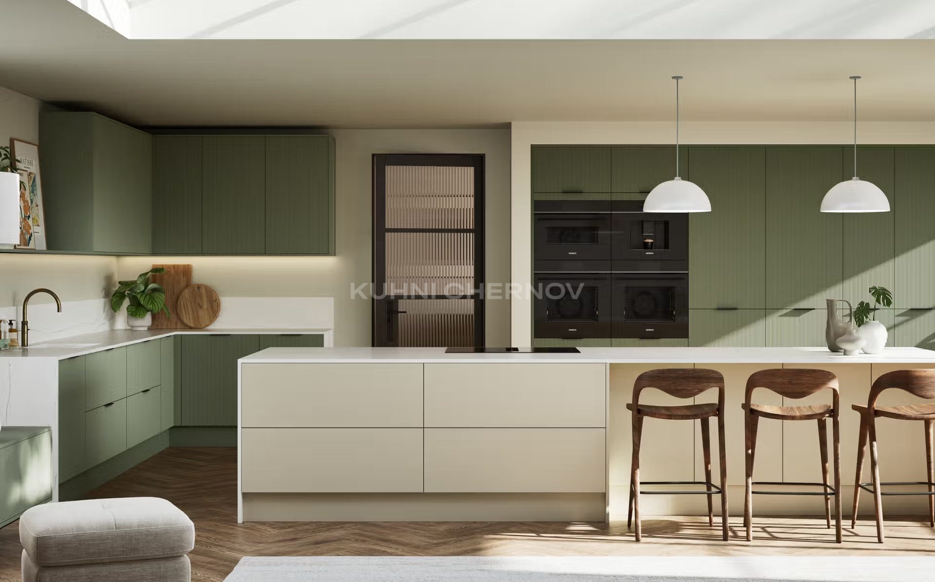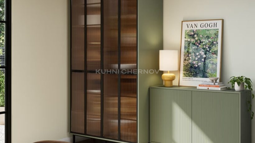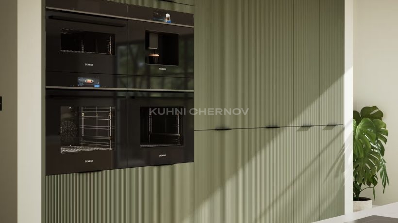 Лоретта — это серия кухонь с фасадами из эмали: гладкими и рифлёными. Сочетание текстур и лаконичных форм создаёт выразительный, современный образ с лёгким налётом ар-деко.