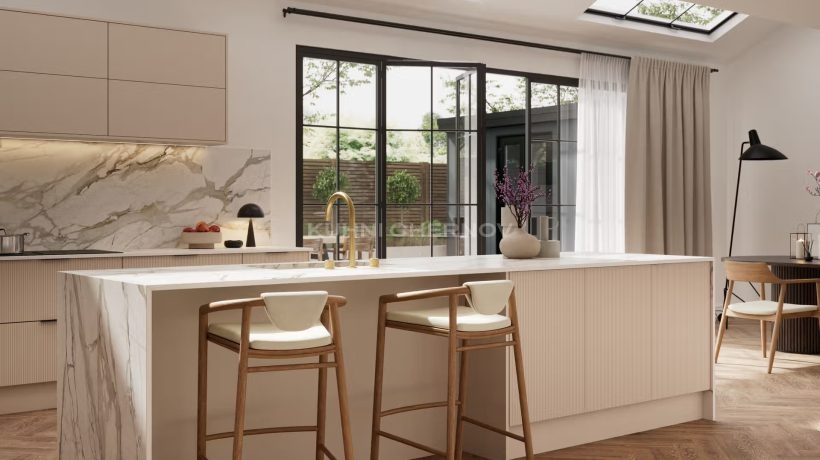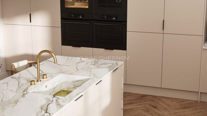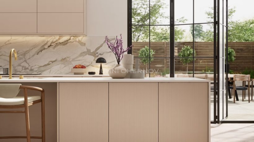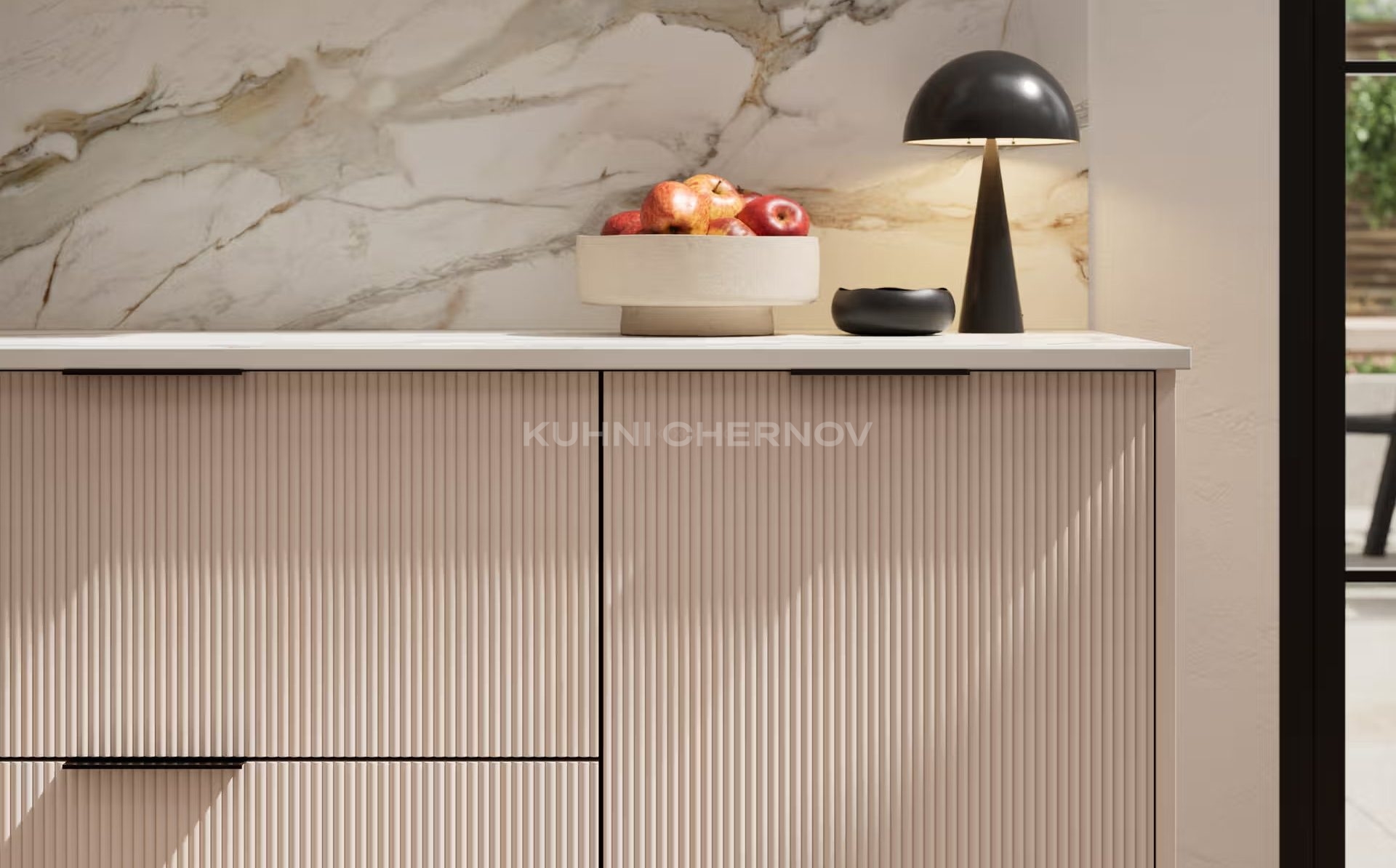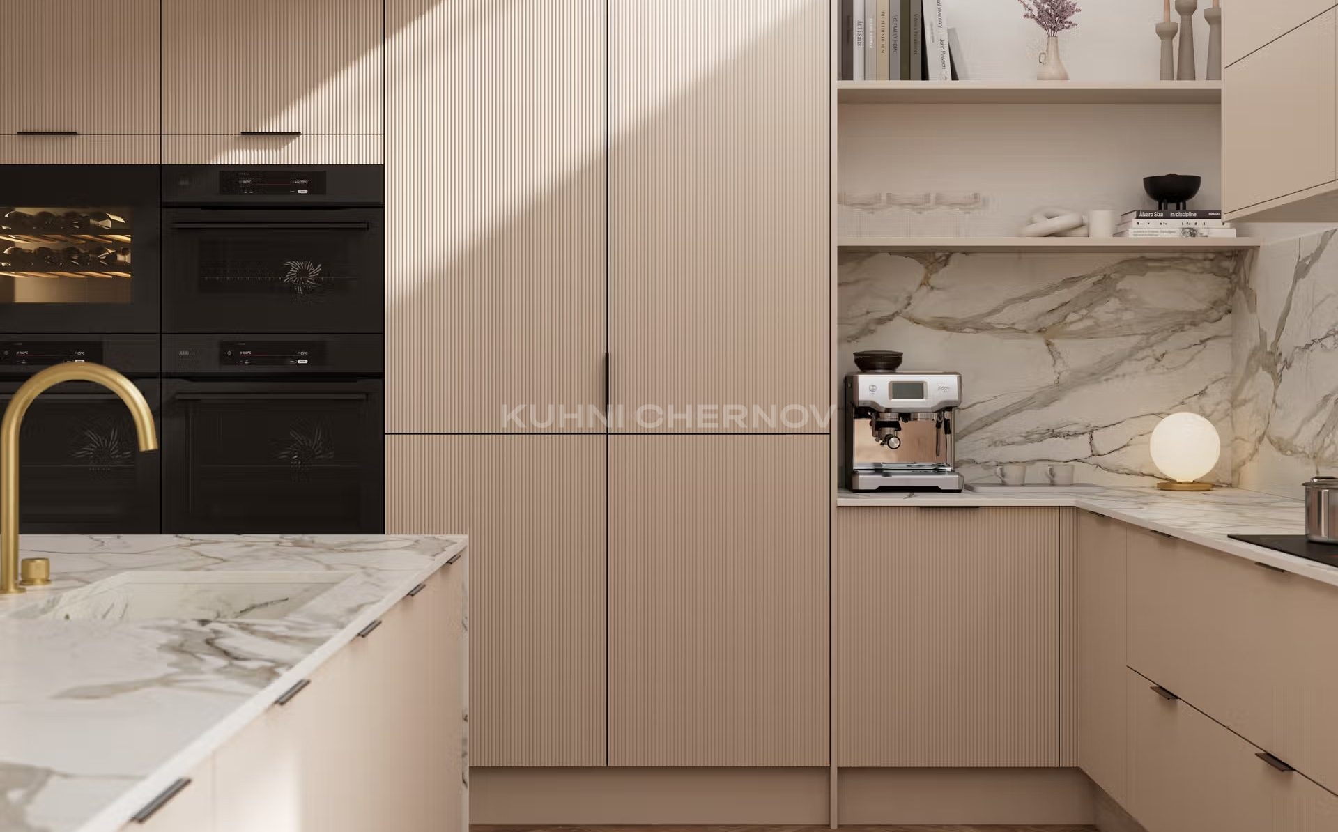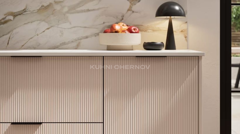 Лоретта — это серия кухонь с фасадами из эмали: гладкими и рифлёными. Сочетание текстур и лаконичных форм создаёт выразительный, современный образ с лёгким налётом ар-деко.