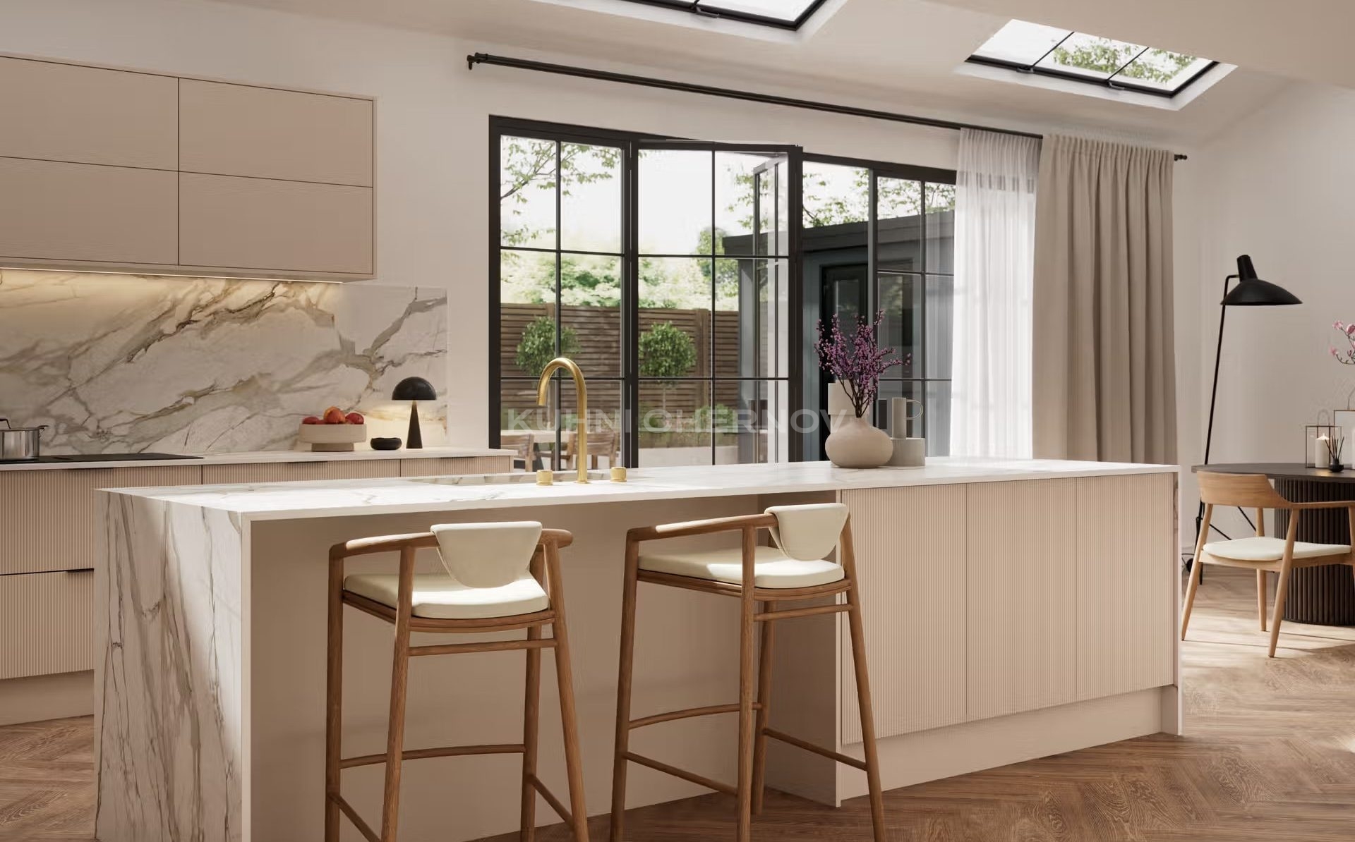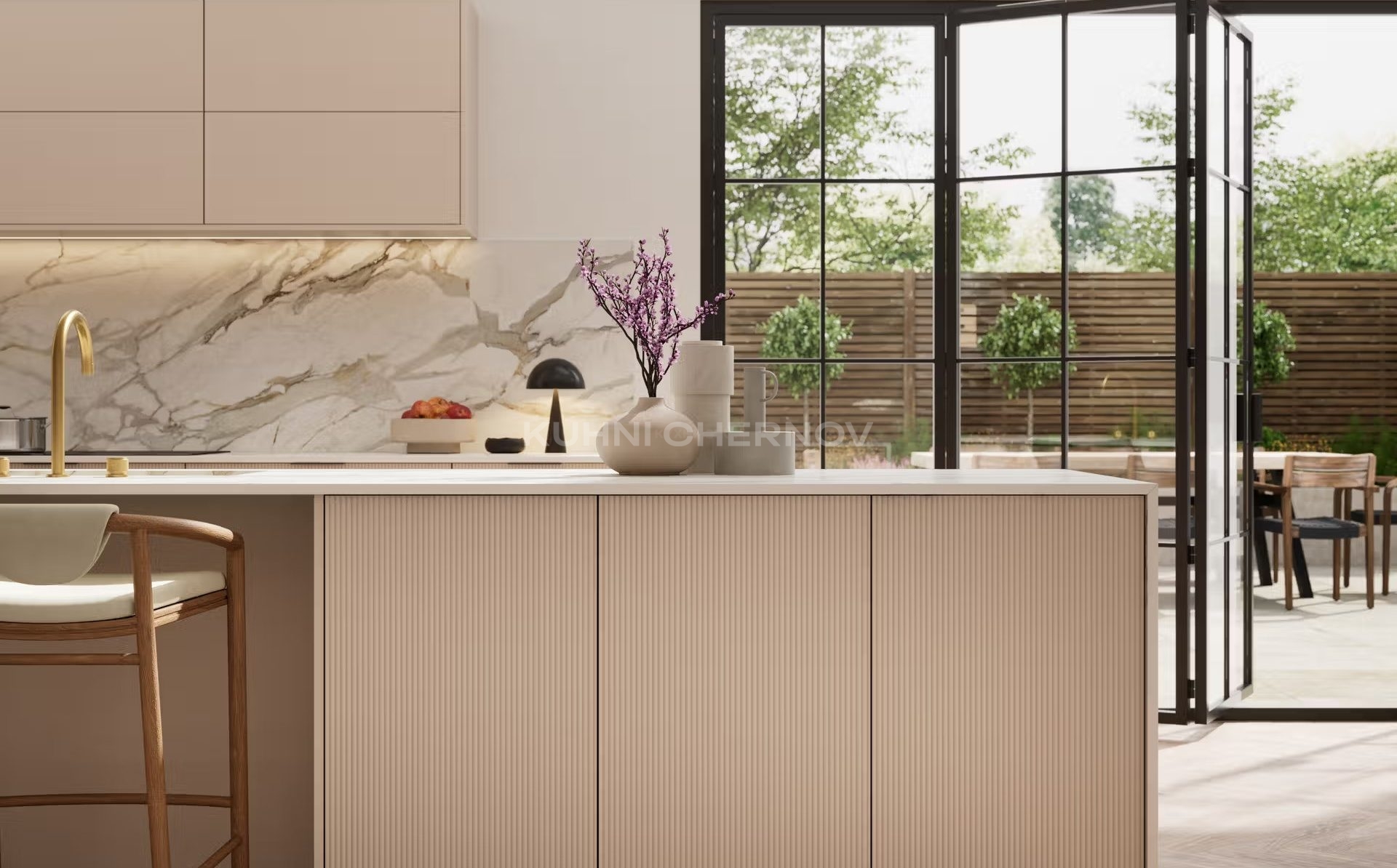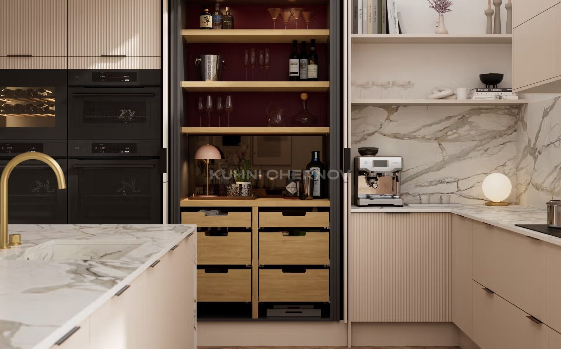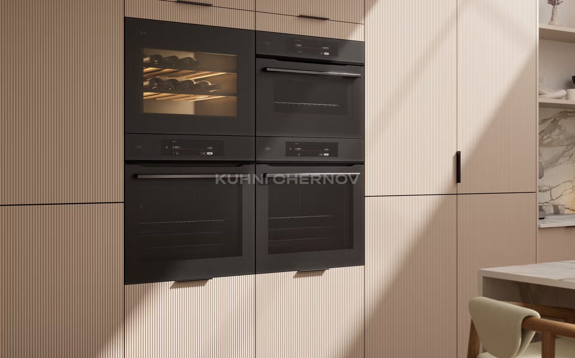 Лоретта — это серия кухонь с фасадами из эмали: гладкими и рифлёными. Сочетание текстур и лаконичных форм создаёт выразительный, современный образ с лёгким налётом ар-деко.