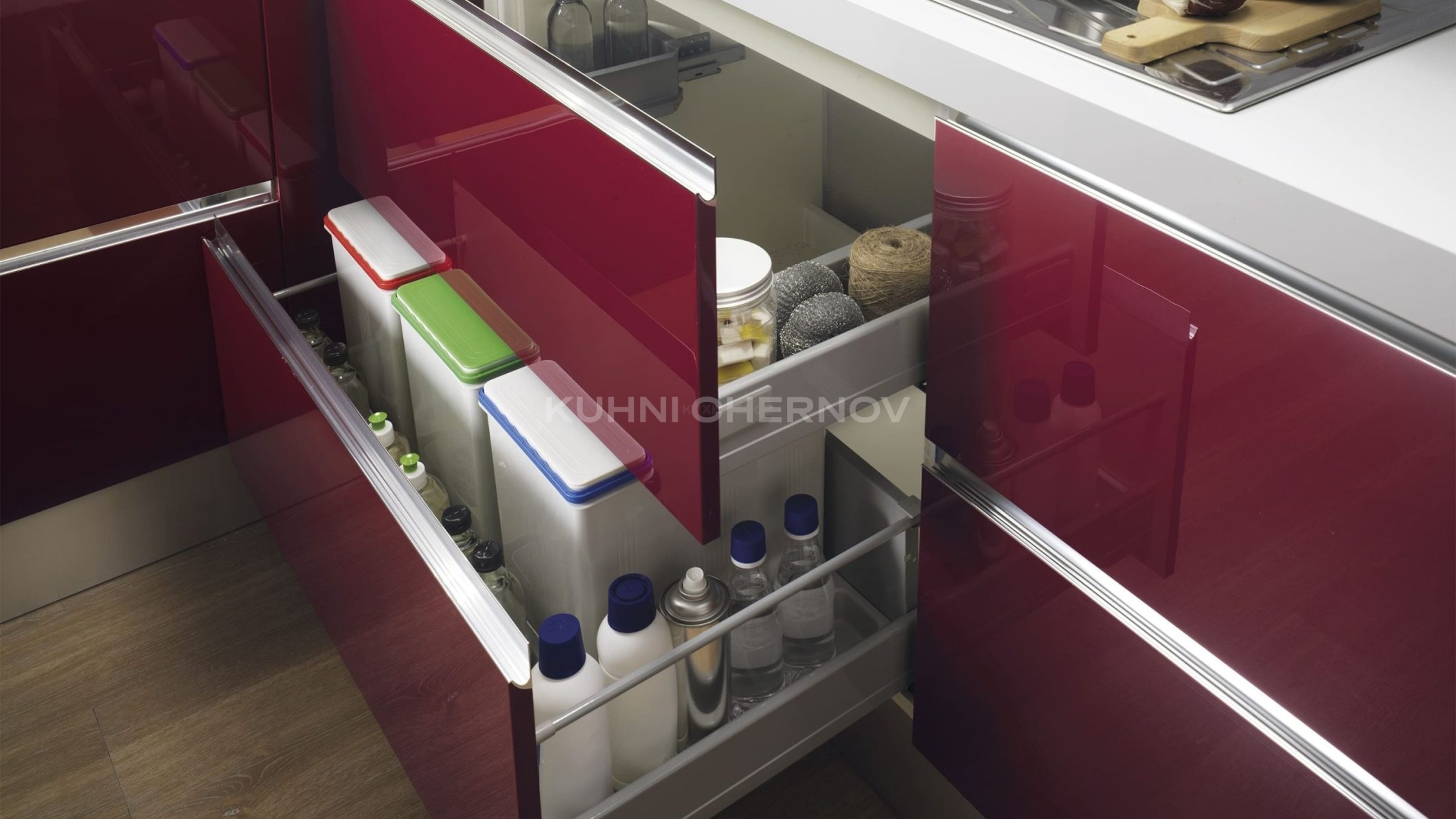 Кухня комплектуется современной фурнитурой от надёжных брендов, таких как Blum, Boyard, GTV и др. Вы можете выбрать систему открывания, доводчики, тип ящиков и внутренние механизмы под индивидуальные задачи и бюджет.