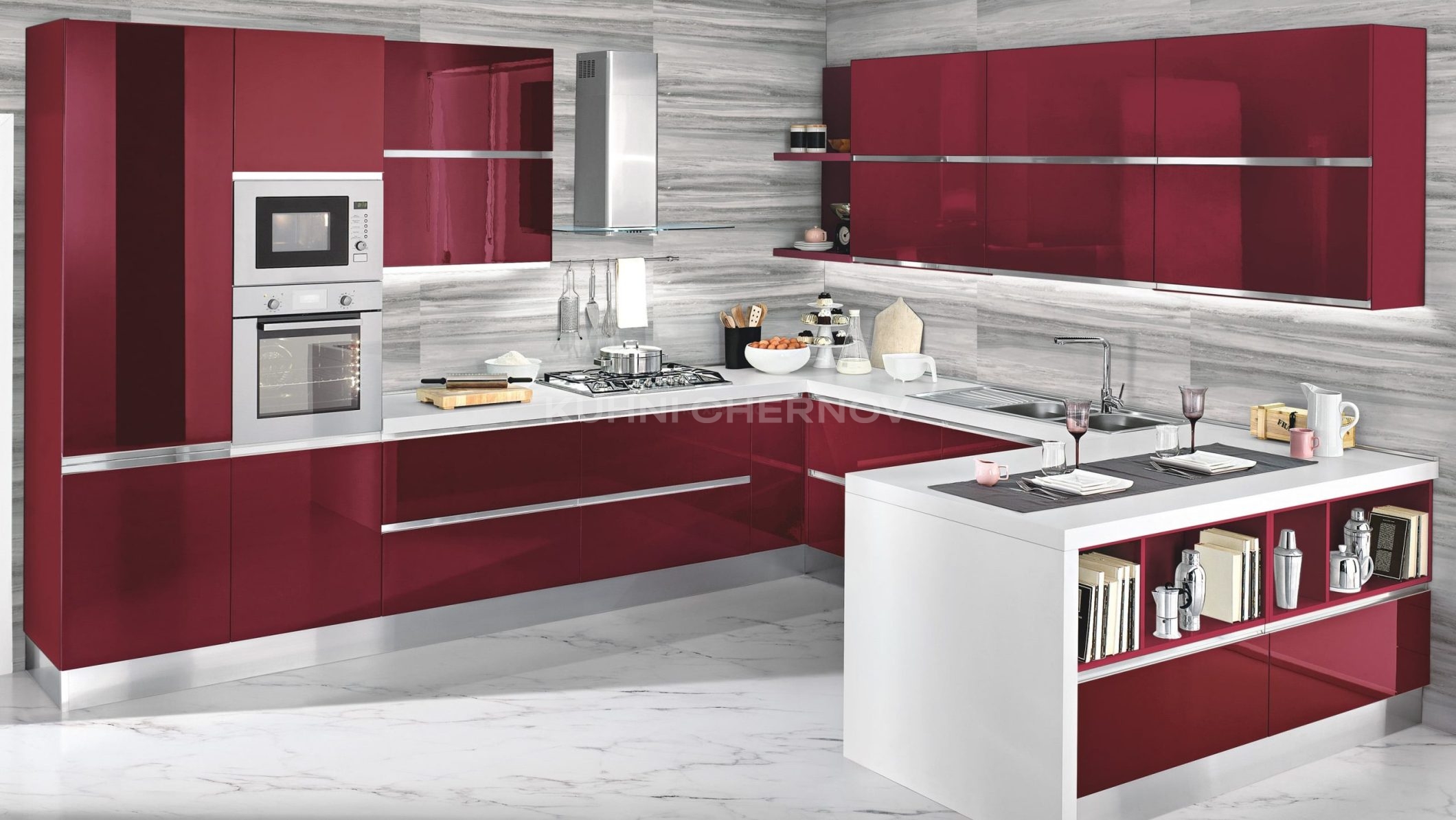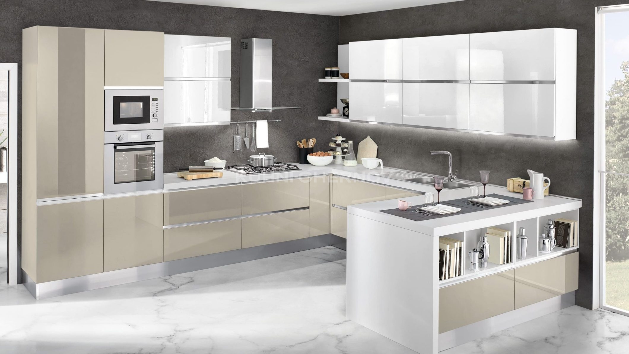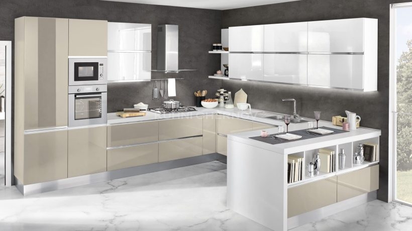 Кухня может быть выполнена в двухцветном варианте, сочетаться с витринами в алюминиевых рамках и адаптироваться под любые планировки.
