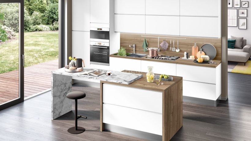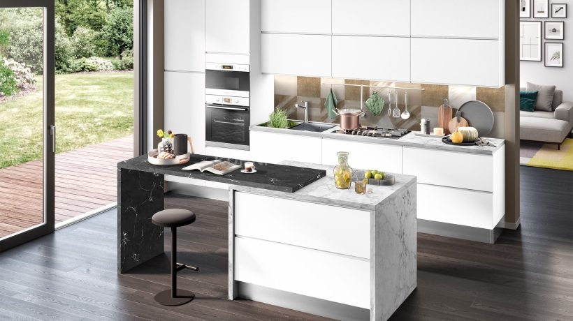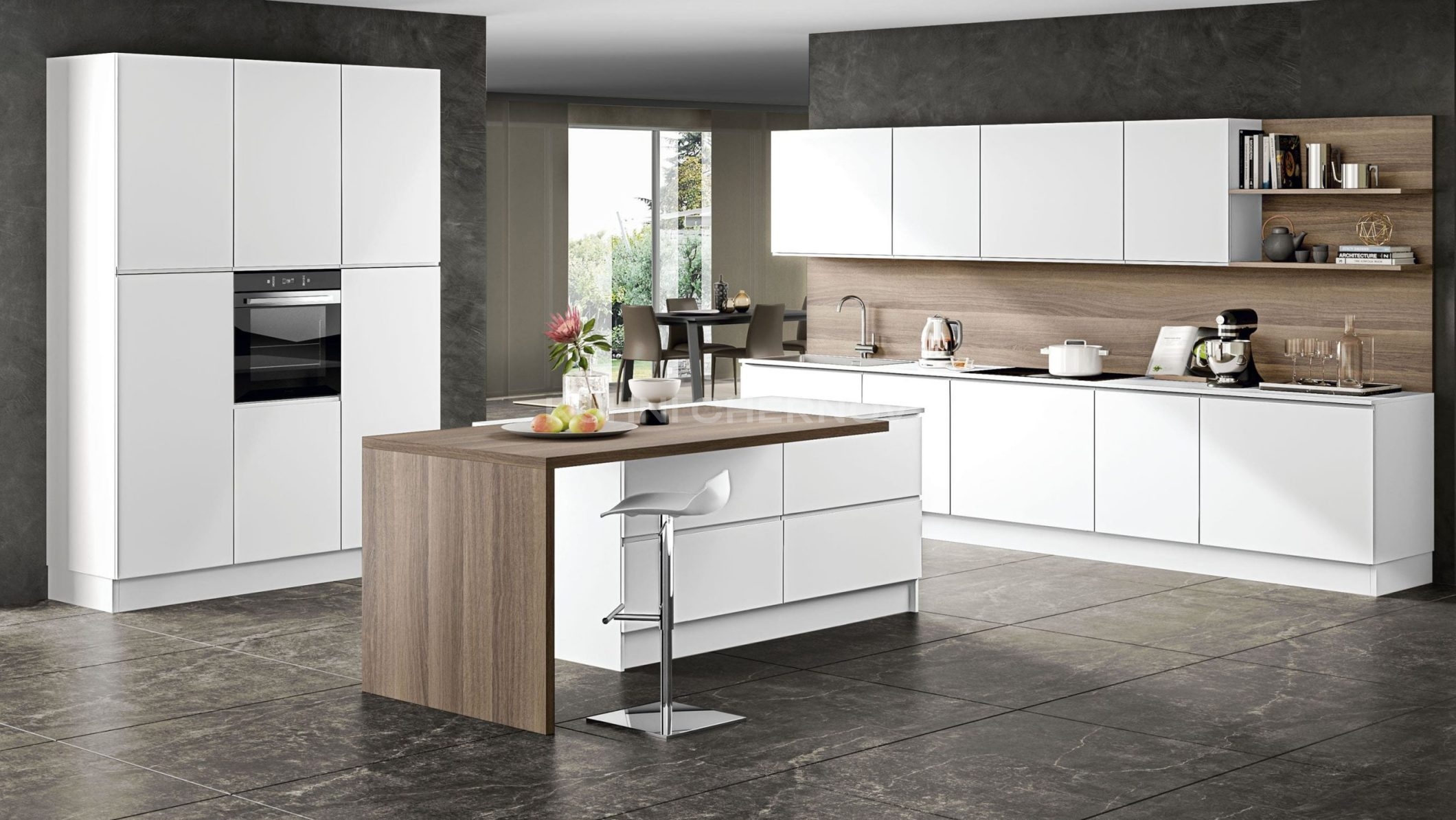 Кухня может быть выполнена в двухцветном варианте, сочетаться с витринами в алюминиевых рамках и адаптироваться под любые планировки.