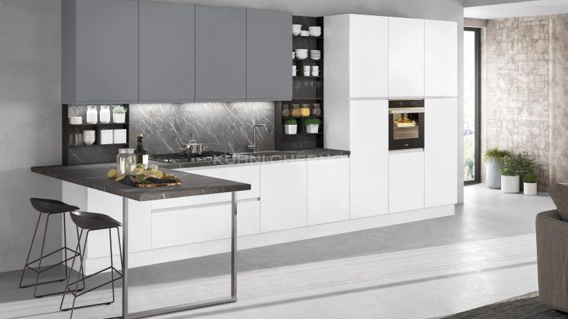 Кухня может быть выполнена в двухцветном варианте, сочетаться с витринами в алюминиевых рамках и адаптироваться под любые планировки.