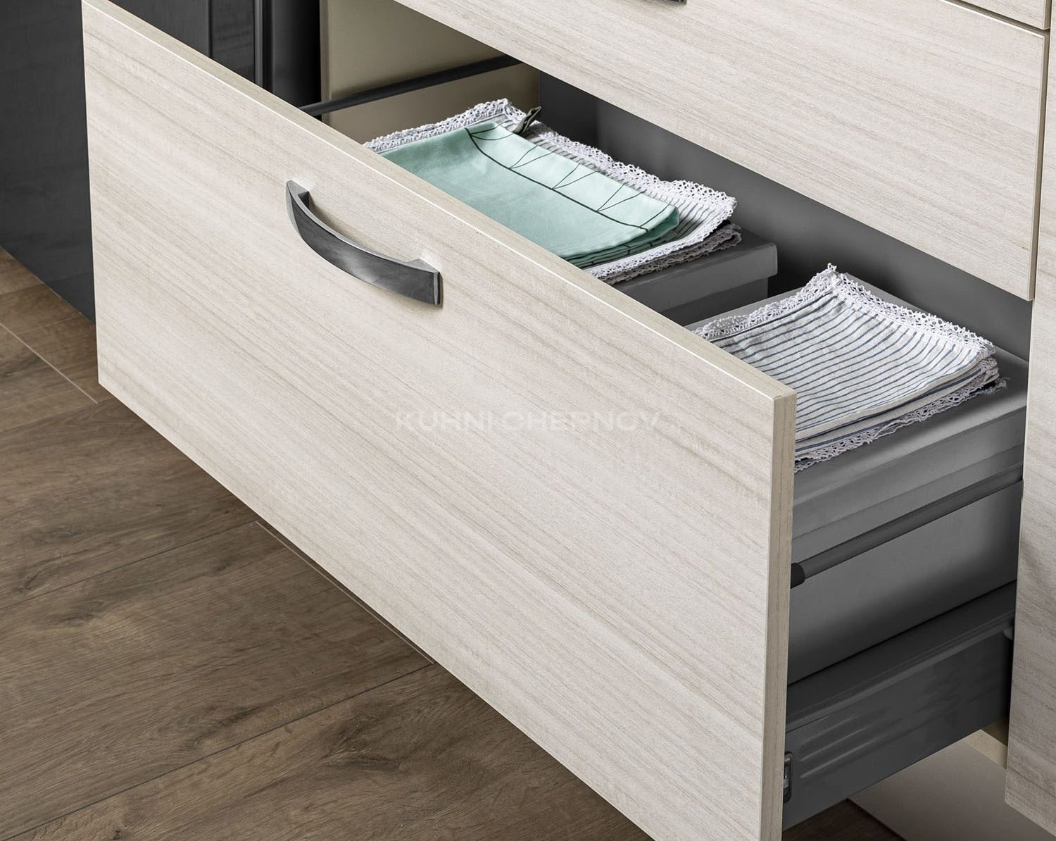 Кухня укомплектована лучшей фурнитурой по вашему выбору: петли с доводчиками, ящики полного выдвижения с системой soft close, подъёмные механизмы, бутылочницы, внутренние разделители и подсветка от ведущих мировых производителей.