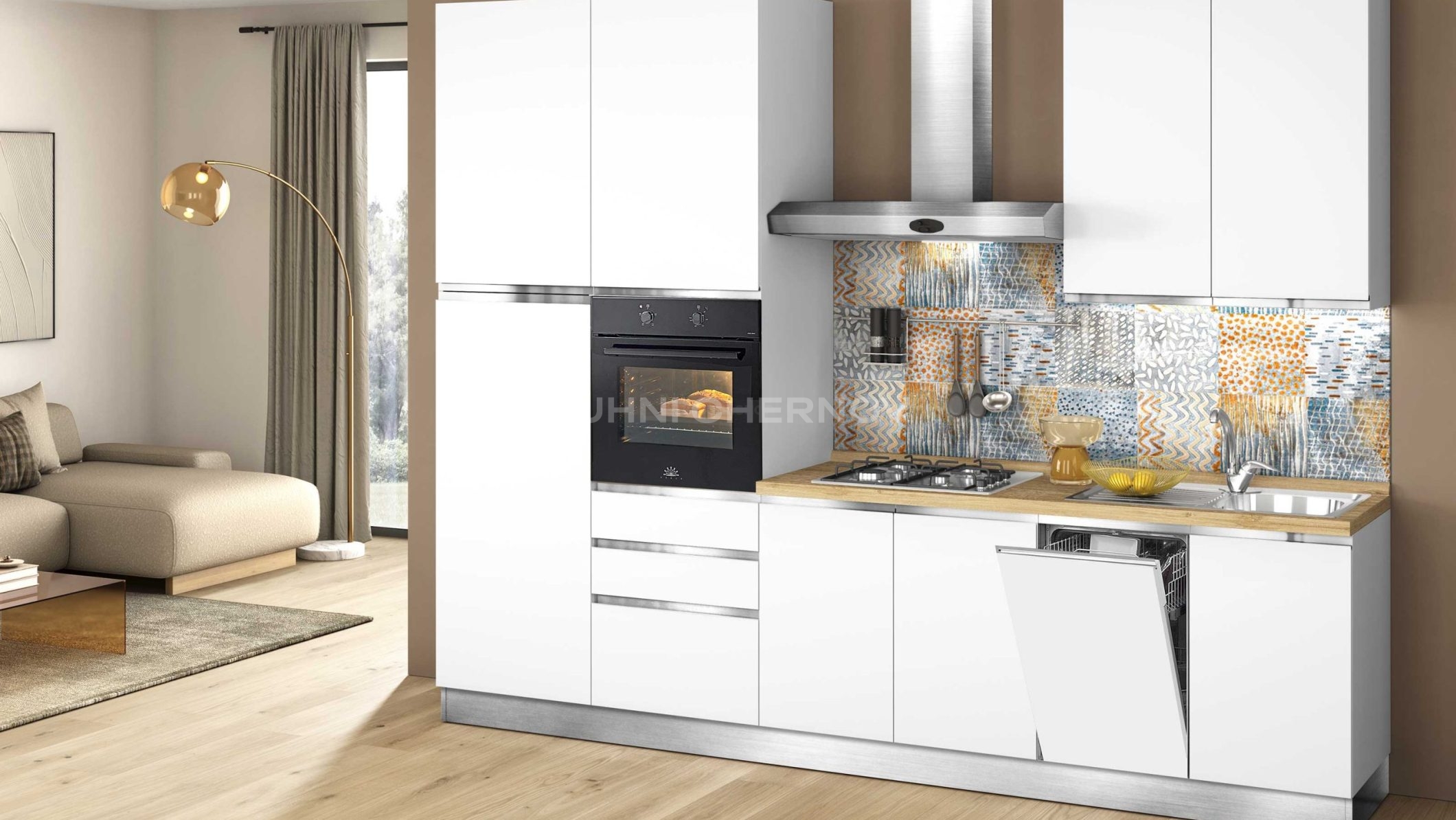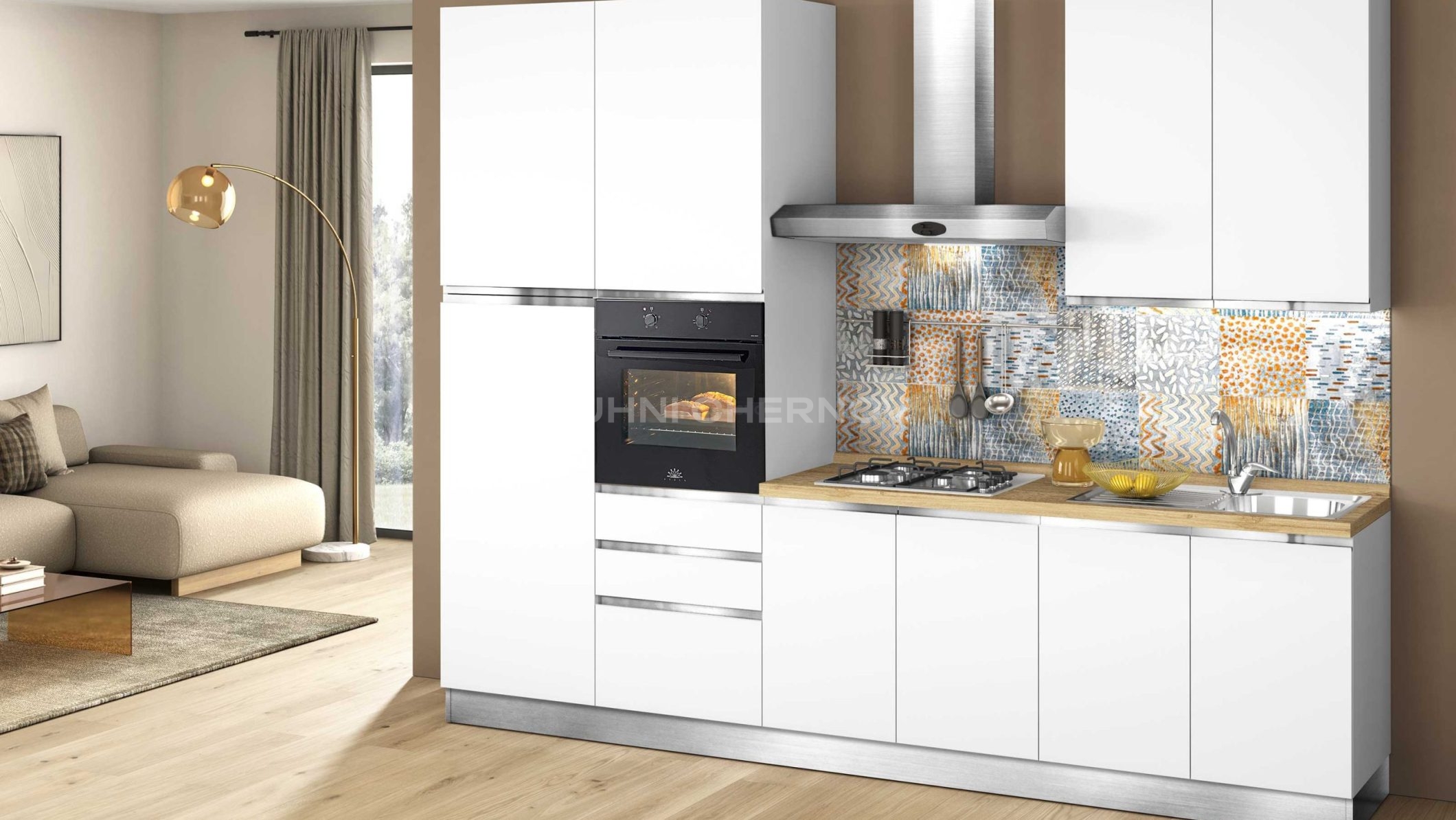 Кухня укомплектована лучшей фурнитурой по вашему выбору: петли с доводчиками, ящики полного выдвижения с системой soft close, подъёмные механизмы, бутылочницы, внутренние разделители и подсветка от ведущих мировых производителей.
