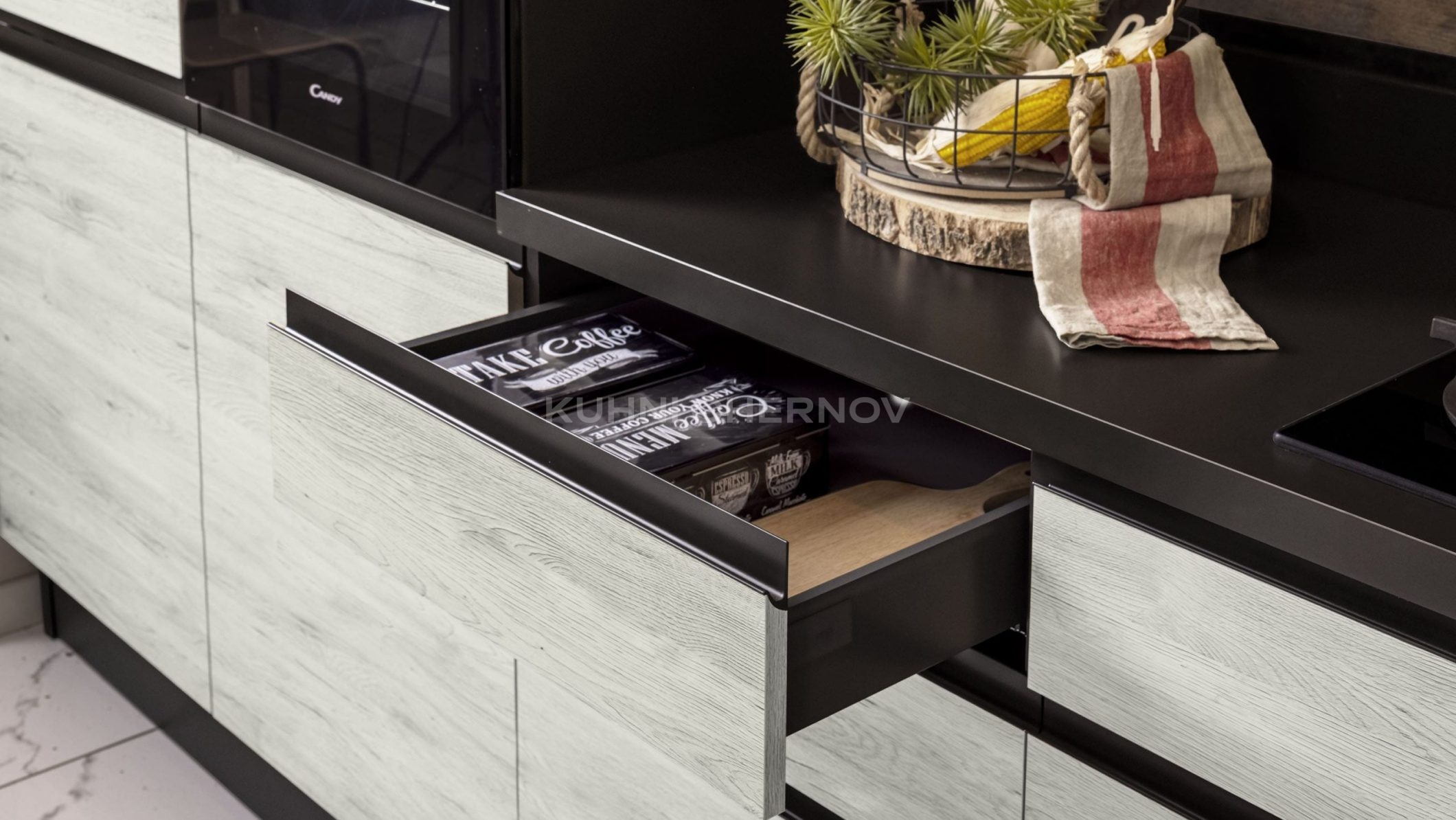 Кухня укомплектована лучшей фурнитурой по вашему выбору: петли с доводчиками, ящики полного выдвижения с системой soft close, подъёмные механизмы, бутылочницы, внутренние разделители и подсветка от ведущих мировых производителей.