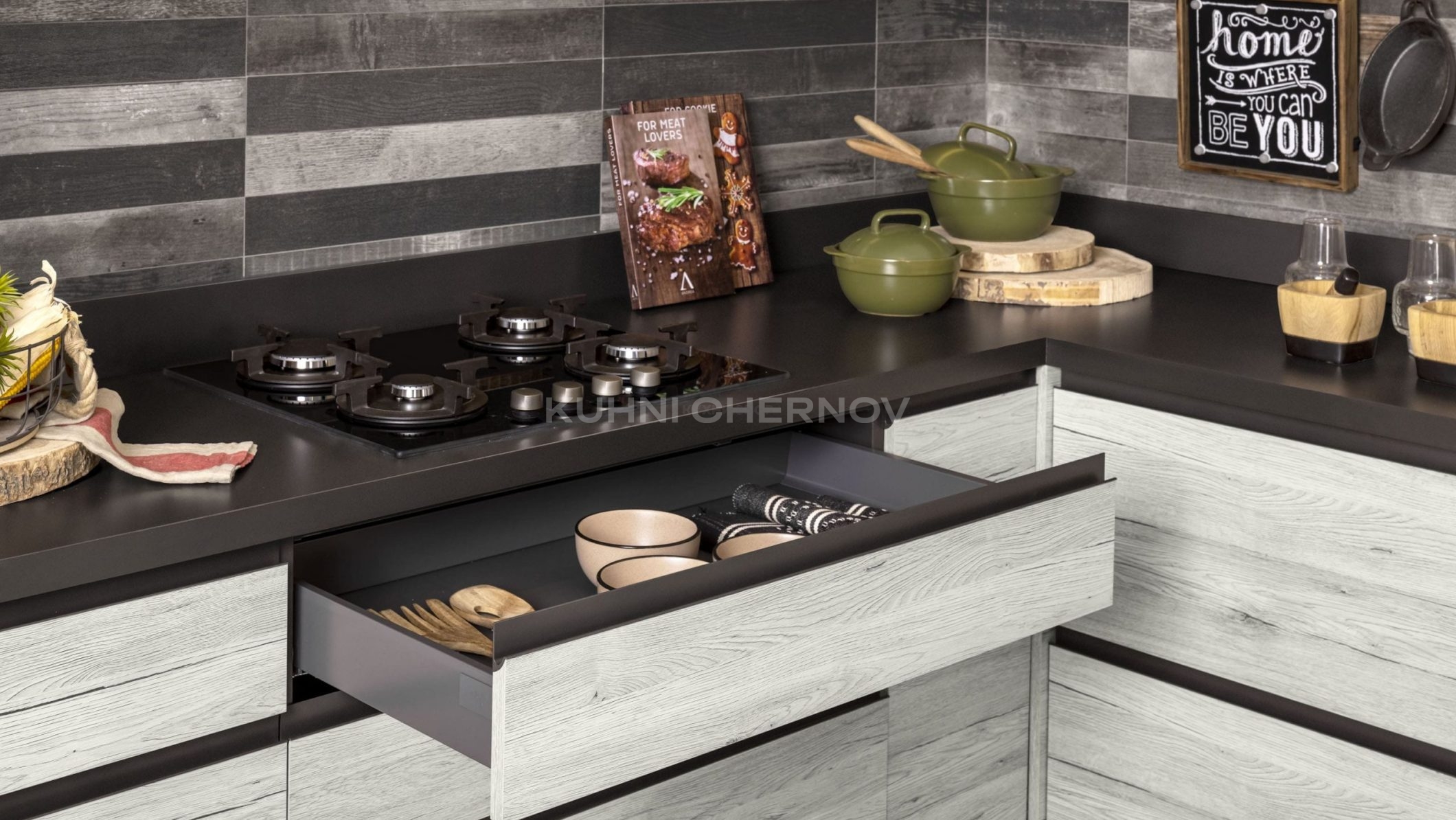 Техна — современная кухня, изготовленная из ЛДСП ведущих производителей — Egger и Kronospan. Качественное кромление и аккуратная обработка торцов обеспечивают высокую износостойкость, долговечность и безупречный внешний вид фасадов.