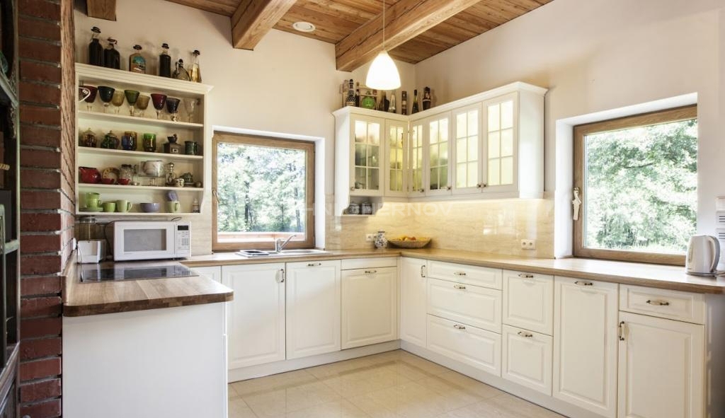 Вся техника встроена аккуратно и не нарушает общего визуального баланса, а продуманная U-образная планировка делает кухню максимально удобной для готовки и хранения. Это кухня, в которой хочется жить — собирать семью на обеды, печь пироги и просто наслаждаться тишиной загородного утра.