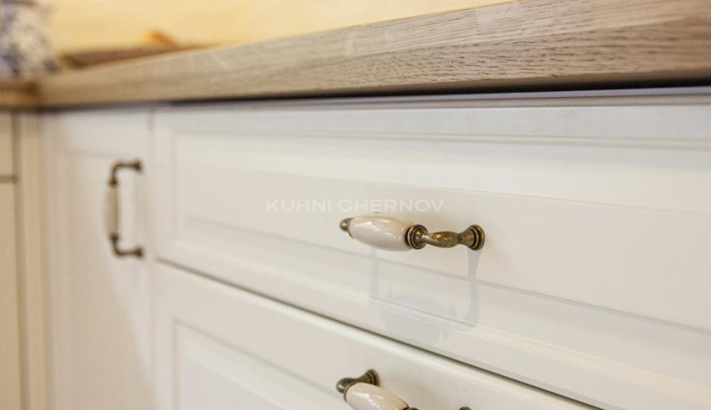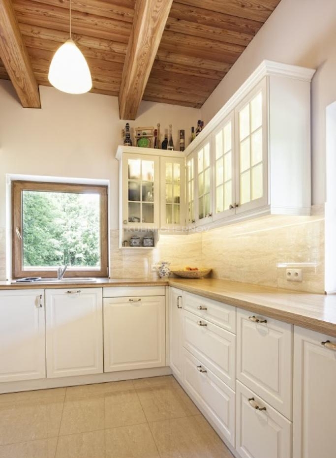 Белые фасады с утончённой фрезеровкой и стеклянными вставками задают тон интерьеру: лёгкий, светлый, по-домашнему уютный. Натуральная древесная столешница мягко перекликается с потолочными балками и создаёт ощущение тепла даже в пасмурный день.