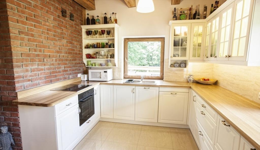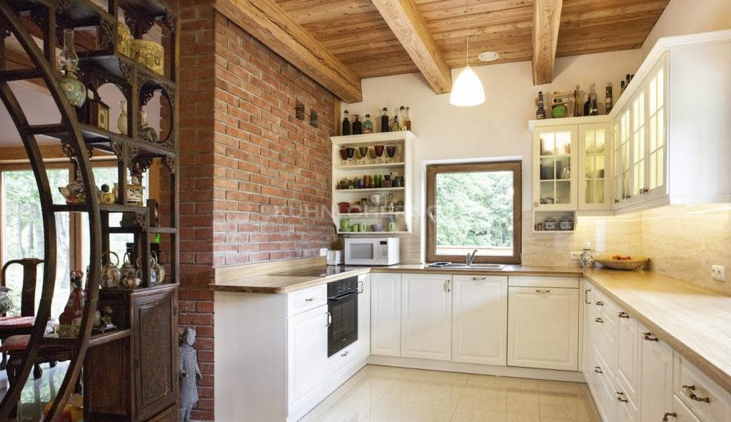 Открытые полки добавляют живого ритма и позволяют удобно разместить любимую посуду, а кирпичная стена придаёт интерьеру характер и визуальную глубину. Окно в деревянной раме наполняет кухню светом и связывает её с природой за пределами дома.