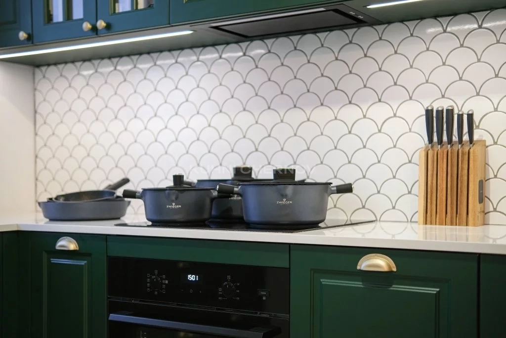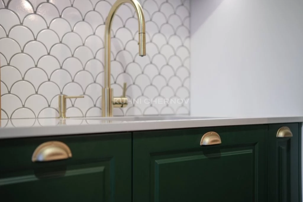 Белоснежная столешница из искусственного камня контрастирует с насыщенной зеленью, создавая безупречную гармонию света и тени. Фартук с геометрическим узором «рыбья чешуя» придаёт интерьеру фактурную глубину и современную изысканность, а золотистые ручки добавляют нотку аристократизма.