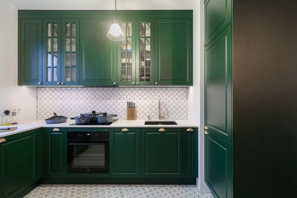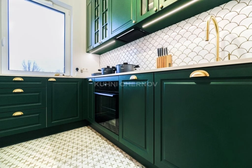 Изумрудная элегантность и классическая геометрия — эта кухня от команды интернет-магазина «Кухни Чернов» воплощает в себе утонченный баланс цвета и формы. Глубокий изумрудно-зеленый оттенок фасадов создает атмосферу роскоши и умиротворения, словно перенося нас в английский загородный дом или французское шато.
