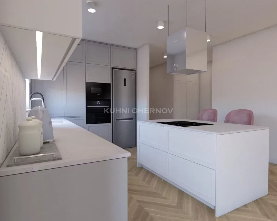 Высокие шкафы до потолка обеспечивают максимум хранения, позволяя поддерживать порядок без визуального перегруза. Вся техника встроена и незаметна — интерьер остаётся цельным и гармоничным.