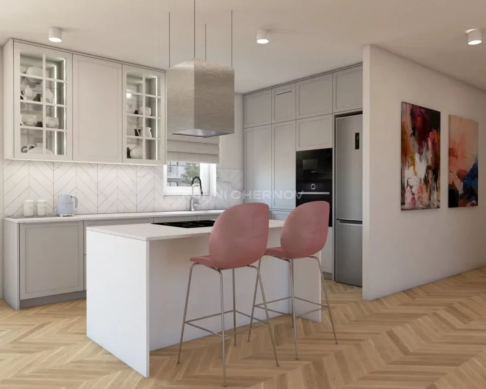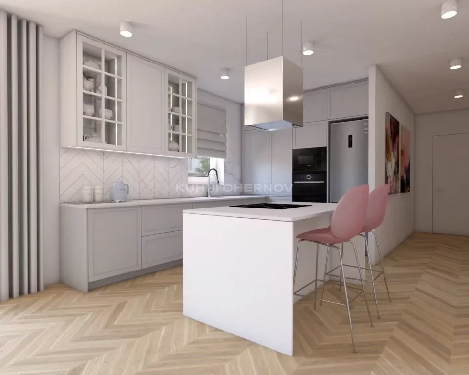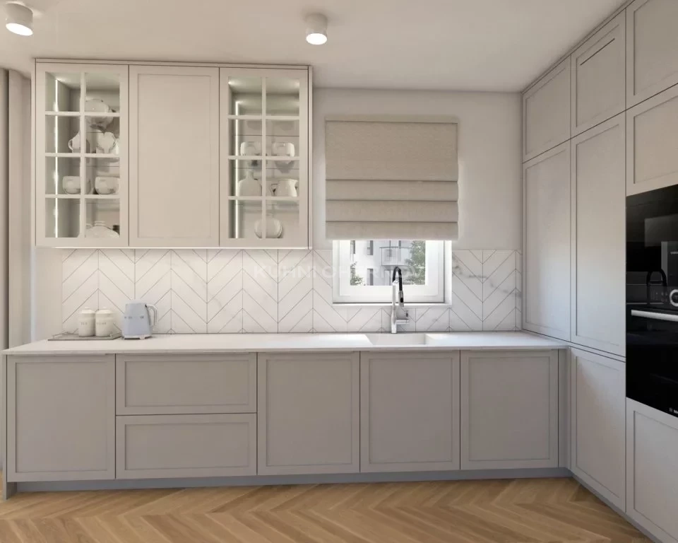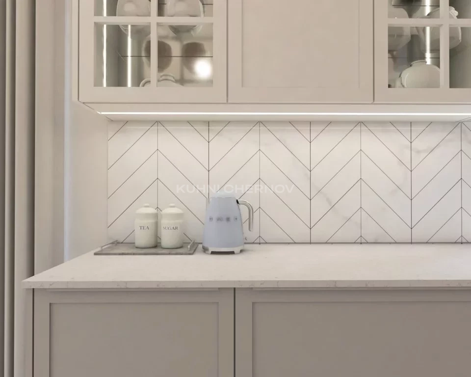 Витринные шкафы с подсветкой добавляют глубины и элегантности, а фартук, выложенный плиткой “ёлочкой”, оживляет интерьер и подчёркивает утончённый вкус. Рабочая зона у окна наполняется естественным светом, превращая готовку в приятный ежедневный ритуал.