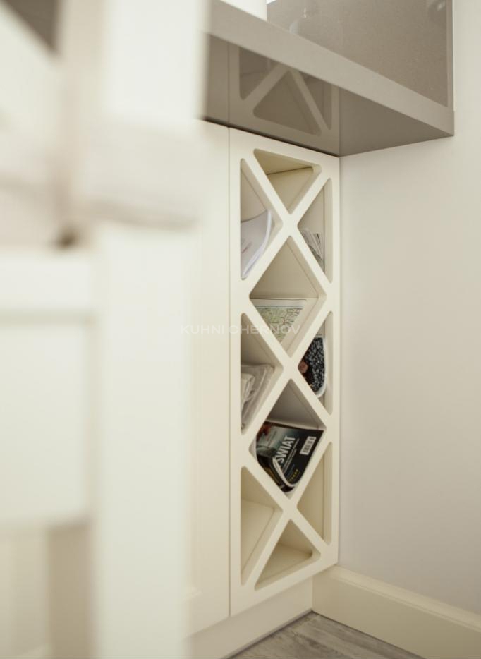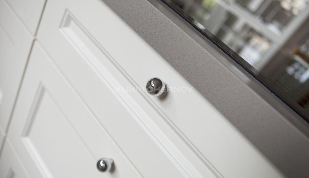 Белоснежные фасады с классической фрезеровкой придают пространству лёгкость и ощущение порядка. Гладкая серая столешница и лаконичный фартук подчёркивают современный ритм, добавляя интерьеру глубины и благородства.
