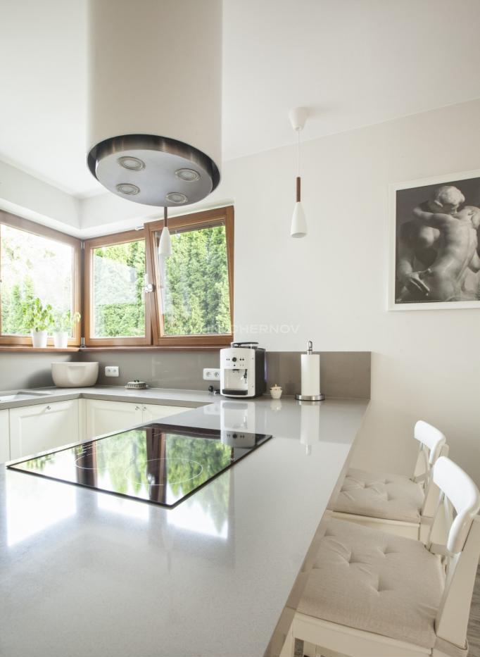 Особое внимание заслуживает угловое остекление: большие окна в деревянных рамах заливают кухню естественным светом, создавая атмосферу уюта и открытого пространства. Центральная барная зона с варочной поверхностью делает интерьер не только функциональным, но и гостеприимным — здесь удобно готовить и одновременно общаться с семьёй или друзьями.