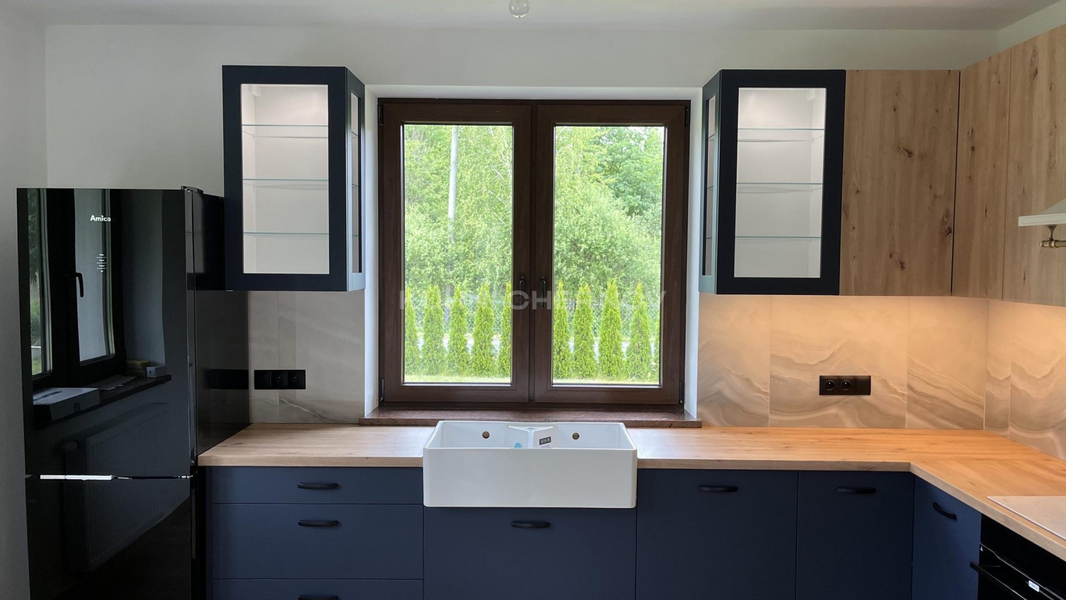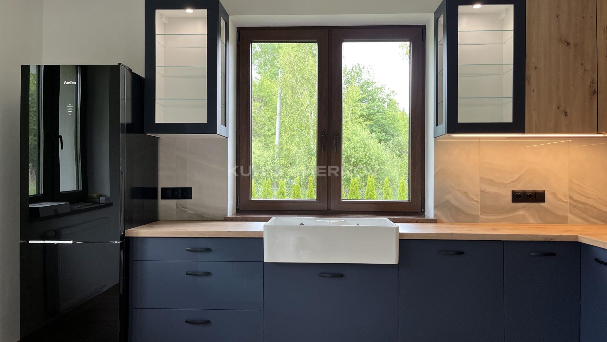 Большие окна с темными рамами словно обрамляют живую картину зеленого сада, делая природу частью интерьера. Керамическая мойка в фермерском стиле подчеркивает связь с традициями, а встроенная подсветка создает уютную атмосферу в вечернее время.