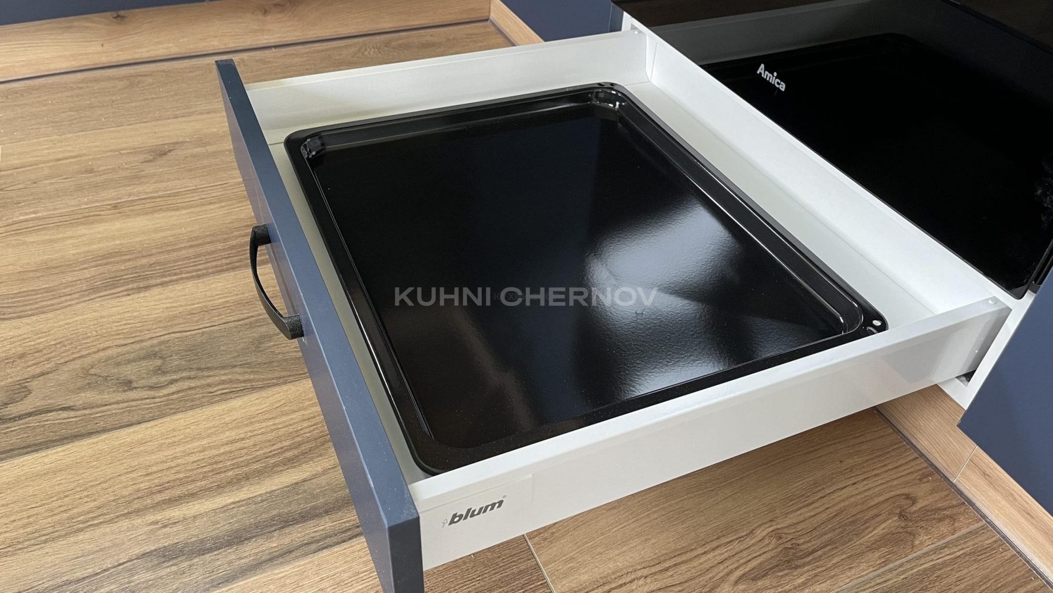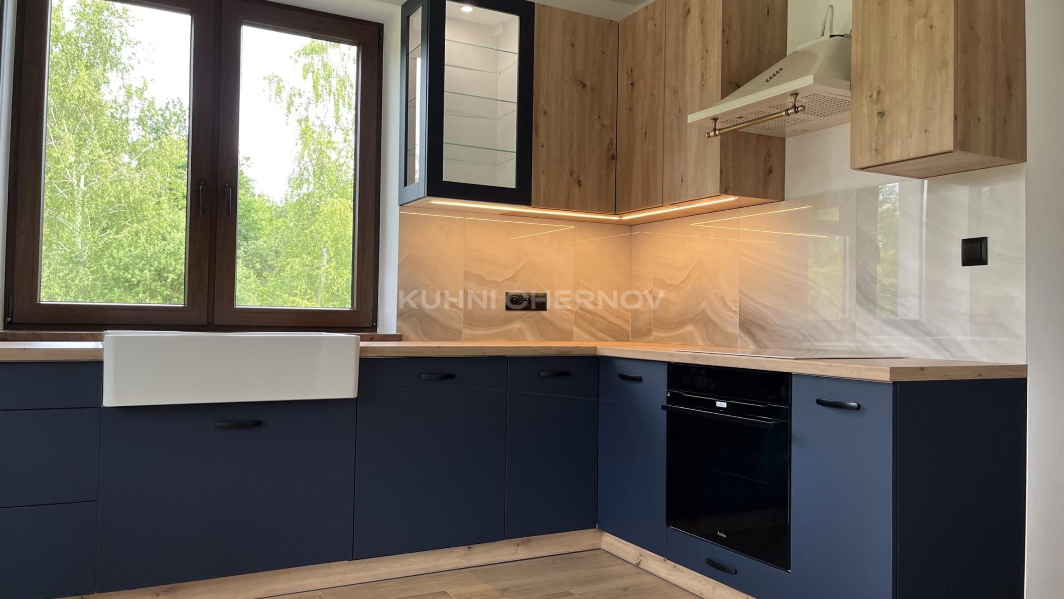 Сочетание глубокого синего цвета нижних фасадов с теплым деревом верхних шкафов напоминает о встрече моря и леса, а мраморный фартук добавляет нотку роскоши.
