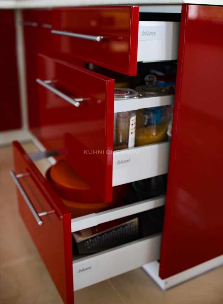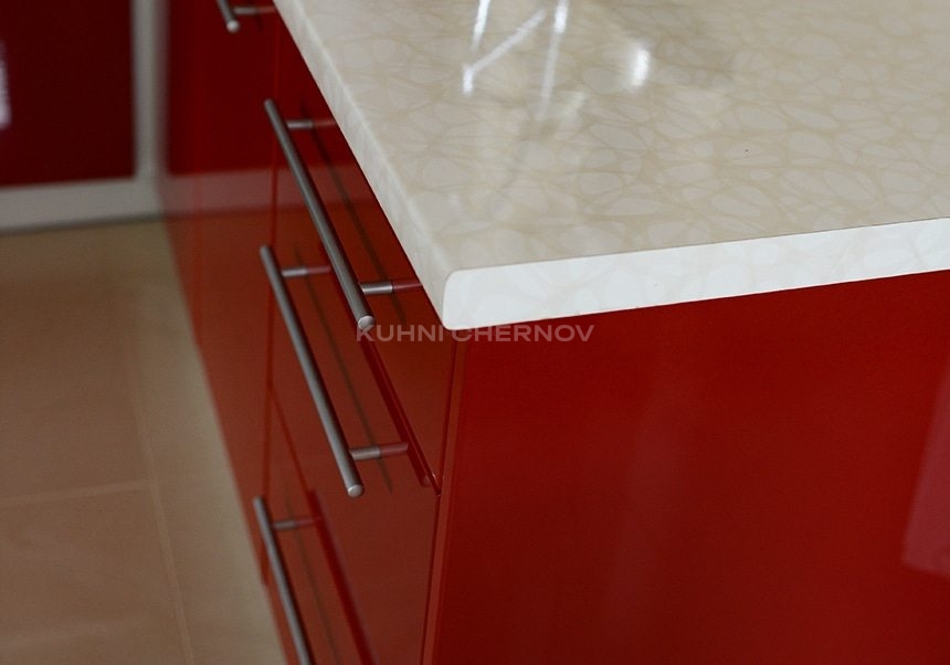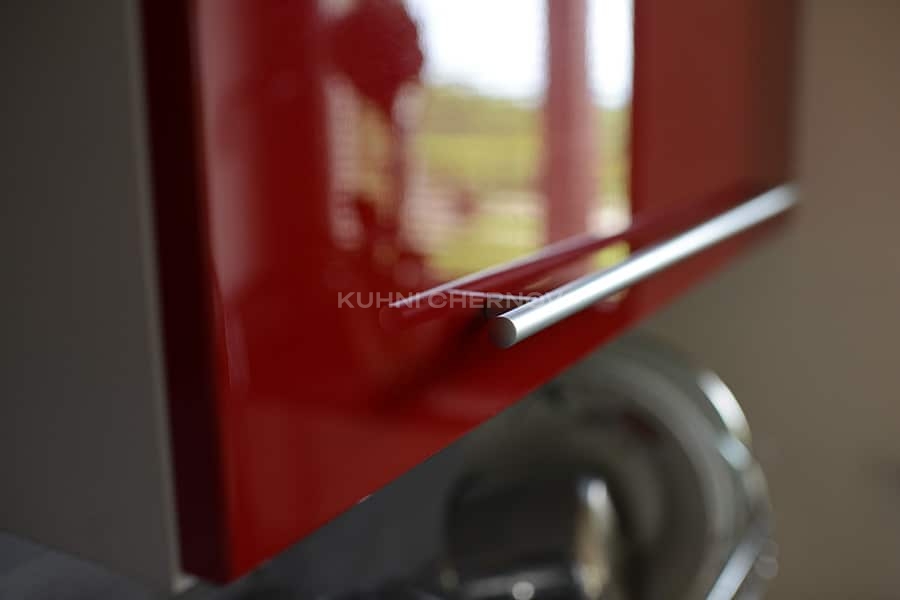 Яркие фасады насыщенного красного цвета выполнены в глянце, благодаря чему кухня словно наполнена светом и движением.