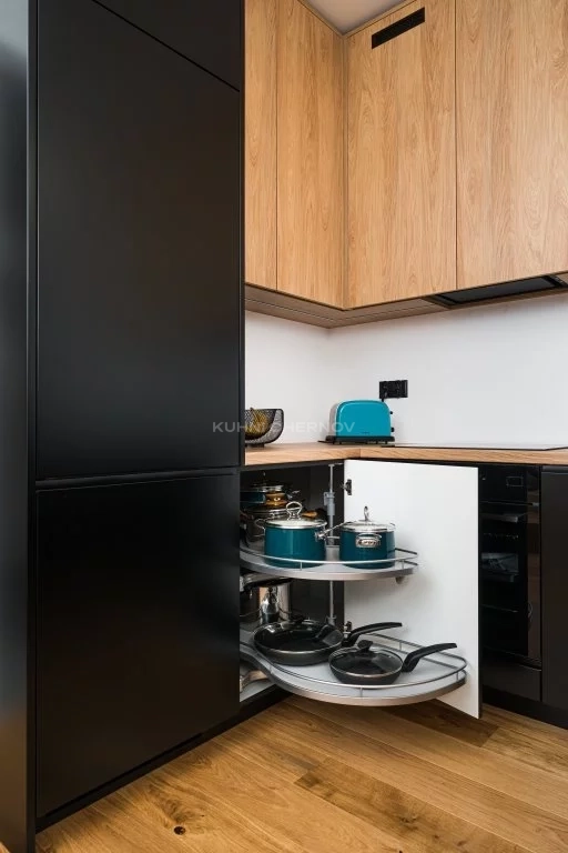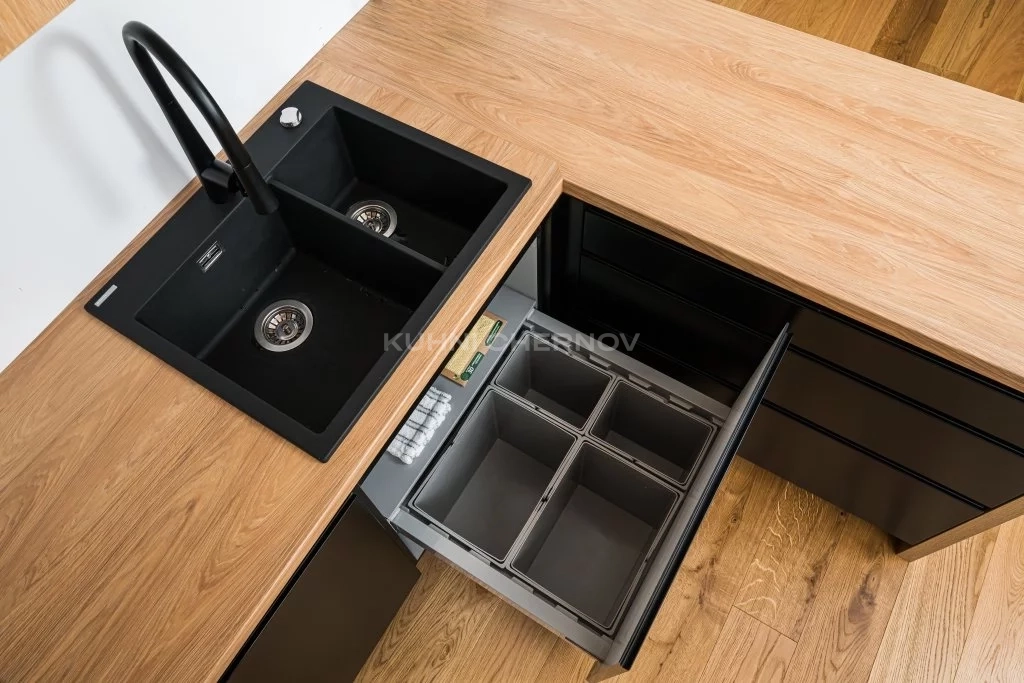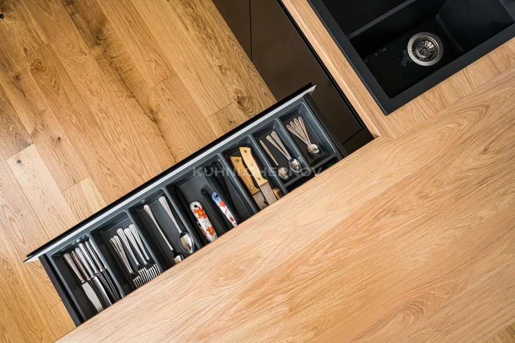 Контраст чёрных ультраматовых фасадов и натуральной древесной текстуры выглядит свежо и современно. Такая комбинация не только подчёркивает геометрию интерьера, но и создаёт баланс между строгостью и уютом.