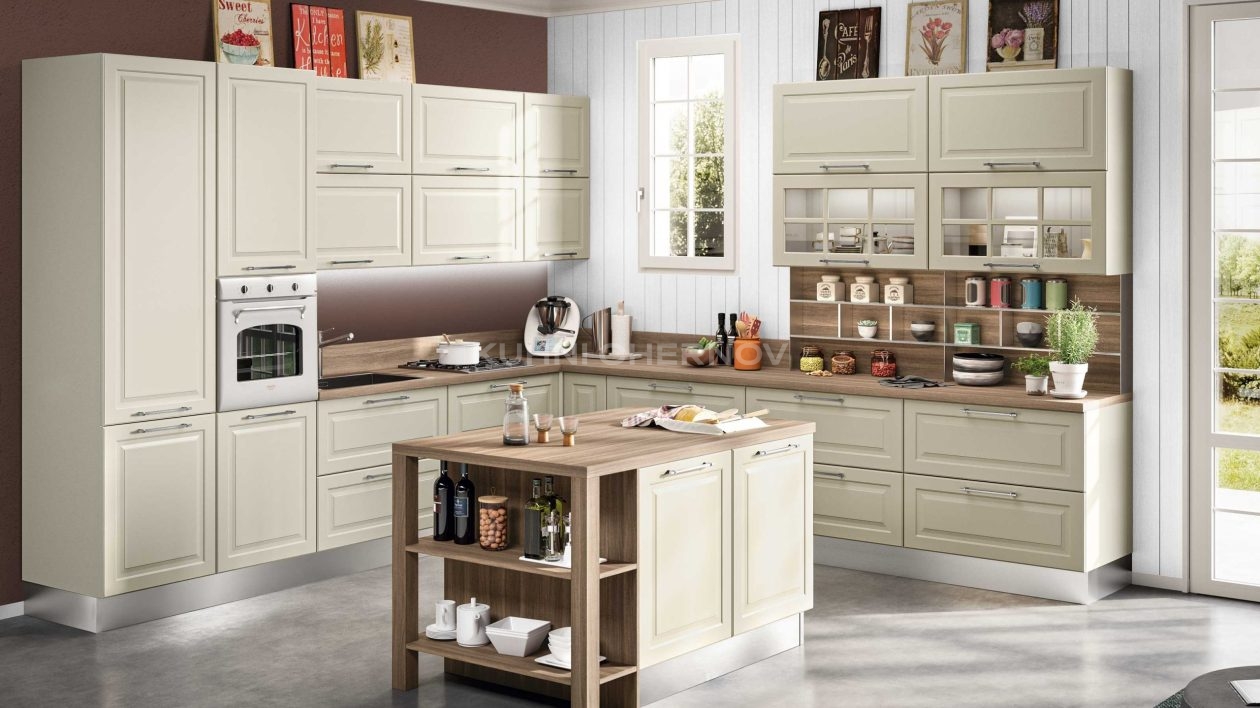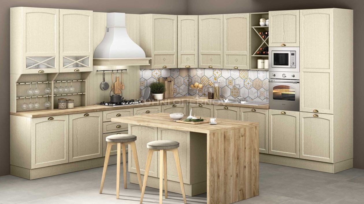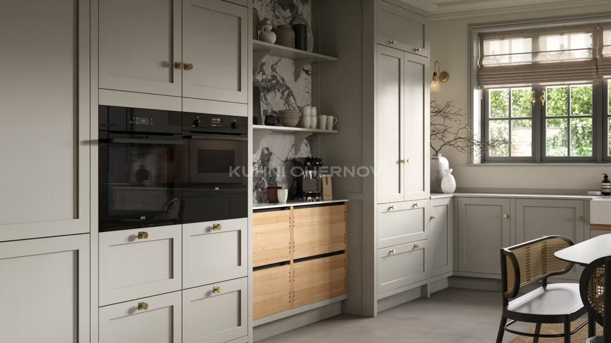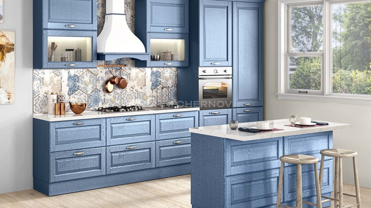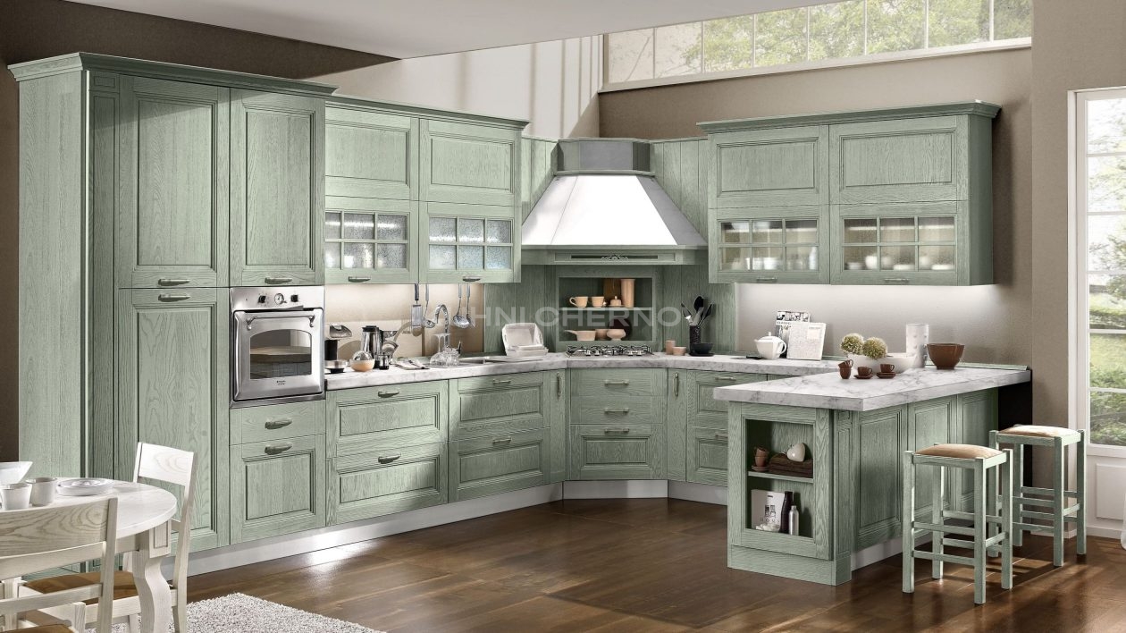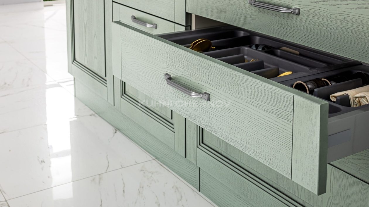 - классика — филенчатые фасады, патинированные ручки, теплые тона дерева;